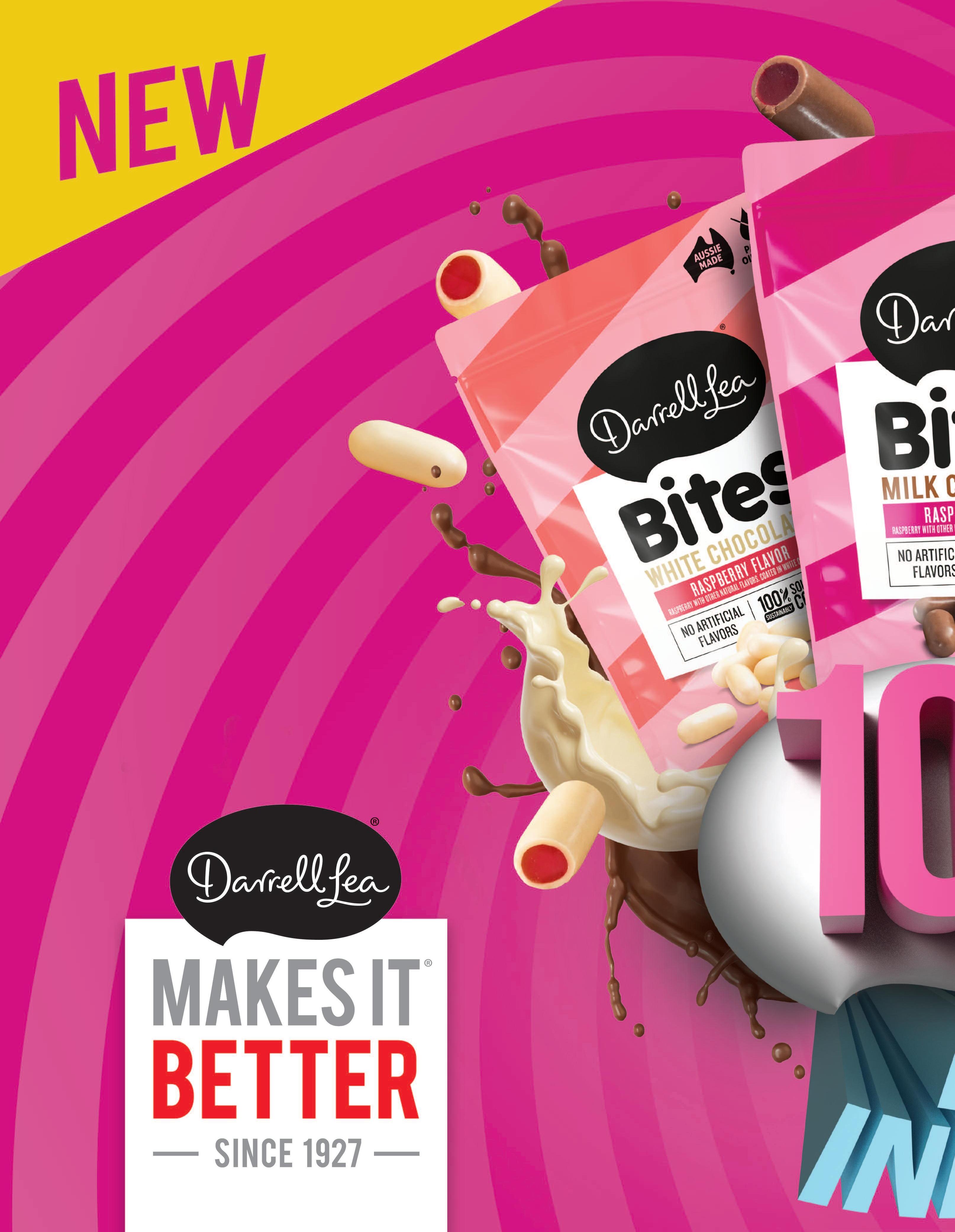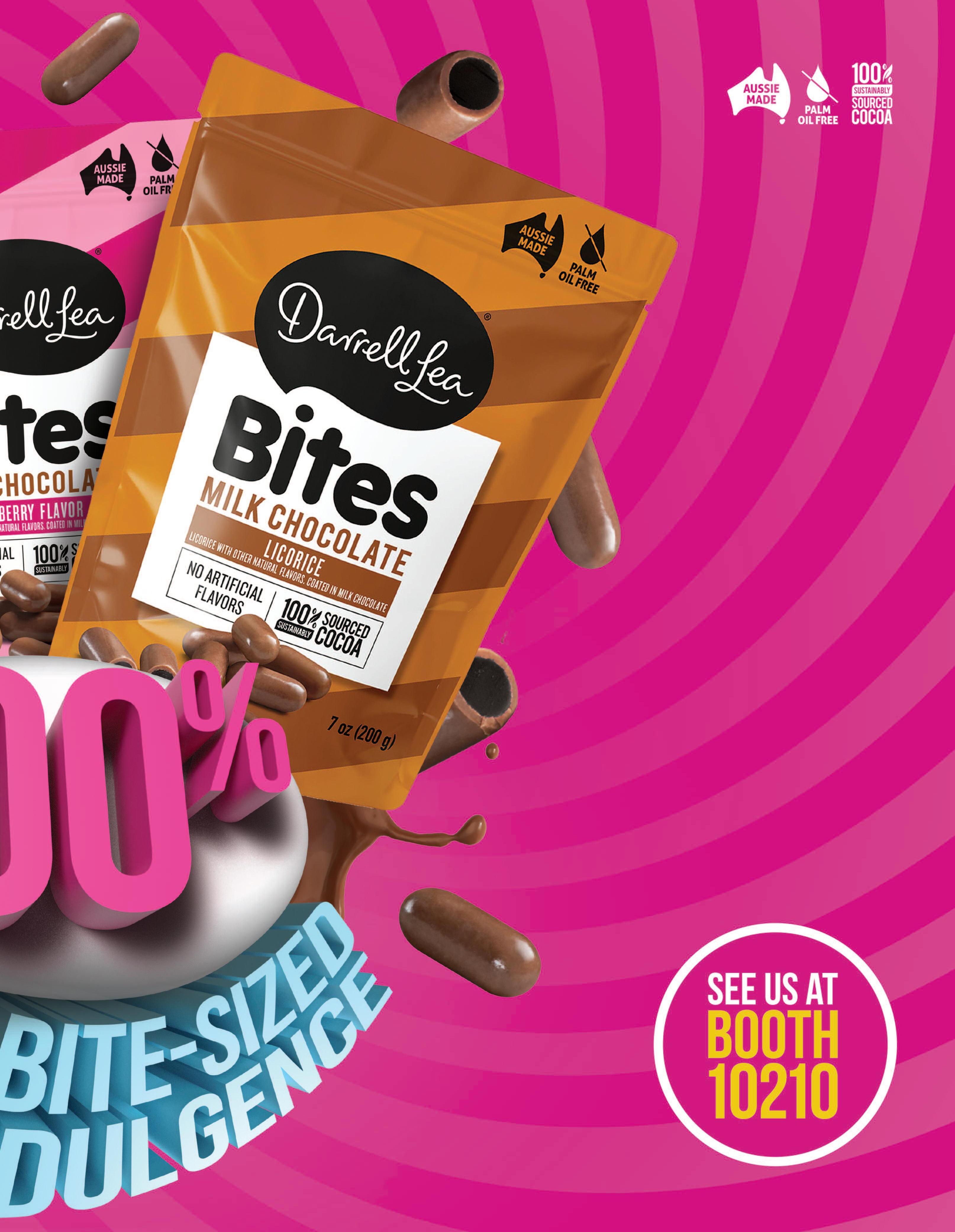 c i o u s n e s s – D a r r e l l L e a C h o c o l a t e Chewy Candy Bites are available in three exciting flavors, including Milk Chocolate with Raspberry Licorice, Milk C h o c o l a t e w i t h B l a c k L i c o r i c e a n d W h i t e C h o c o l a t e w i t h R a s p b e r r y L i c o r i c e , l a u n c h e d t h i s s p r i n g T h e chocolate bites are proudly palm oil free, made in Australia and made with 100 percent sustainably sourced cocoa L i v e t h e s w e e t l i f e w i t h t h e n e w