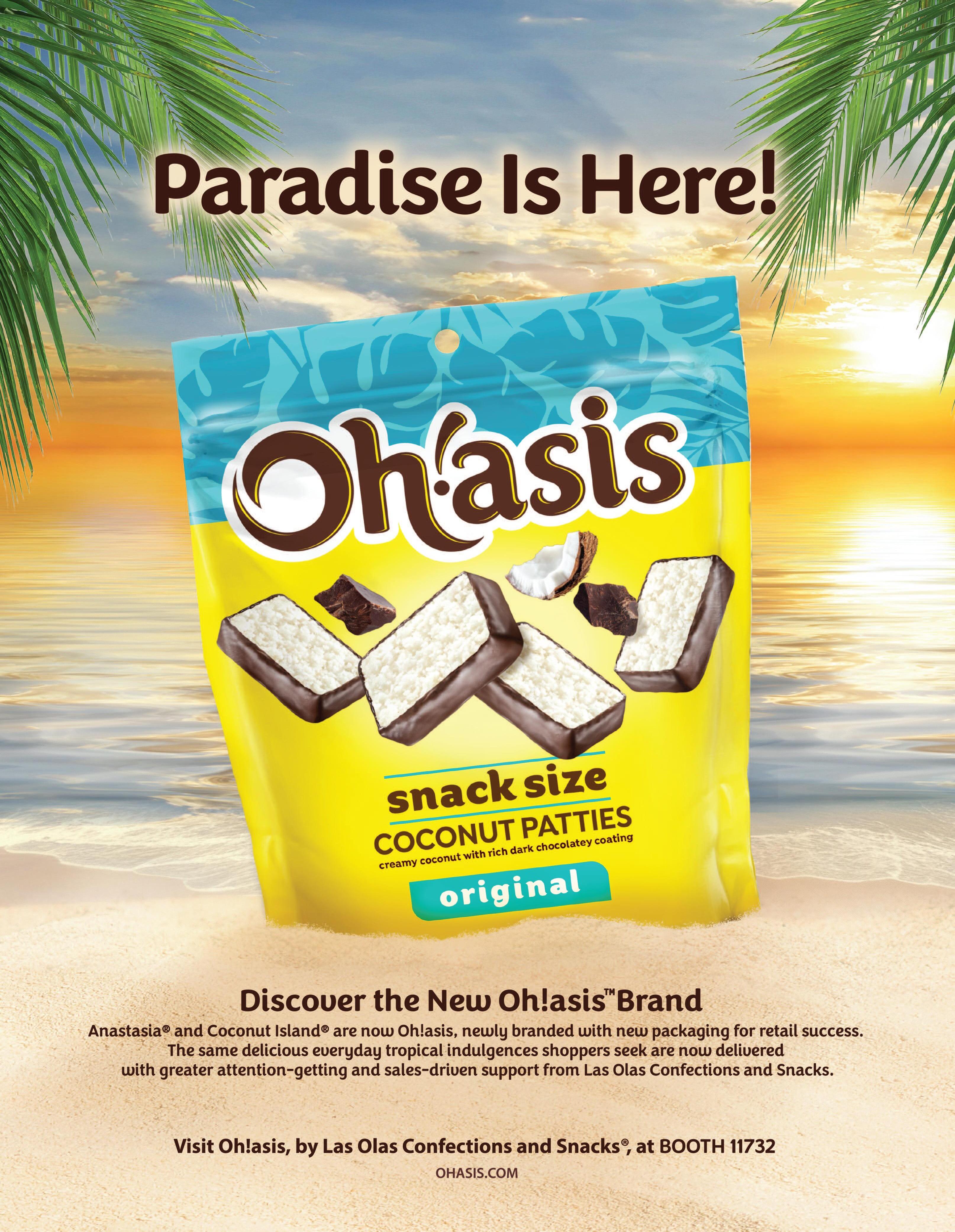 Our award-winning Las Olas Anastasia® and Coconut Island® brands may have been transfor med under the Oh!asis™ rebrand, but two things have remained the same Fans of our Coconut Patties and Coconut Cashew Crunch will be thrilled to find that while Oh!asis’ outside pack aging may look different, the products on the inside are just as yummy and indulgent as ever