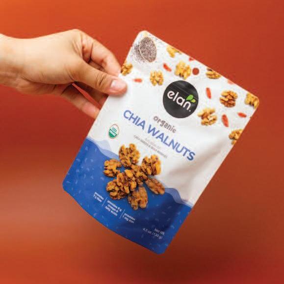 Elan’s innovative snacks combine the dynamic tex tures and nutrients of nuts and super foods. Fan-favor ites include Chia Walnuts, Coconut Cashews and the Fiji M ix. These organic and nutr itious snack ing options are ideal for snackers on the go and health enthusiasts.