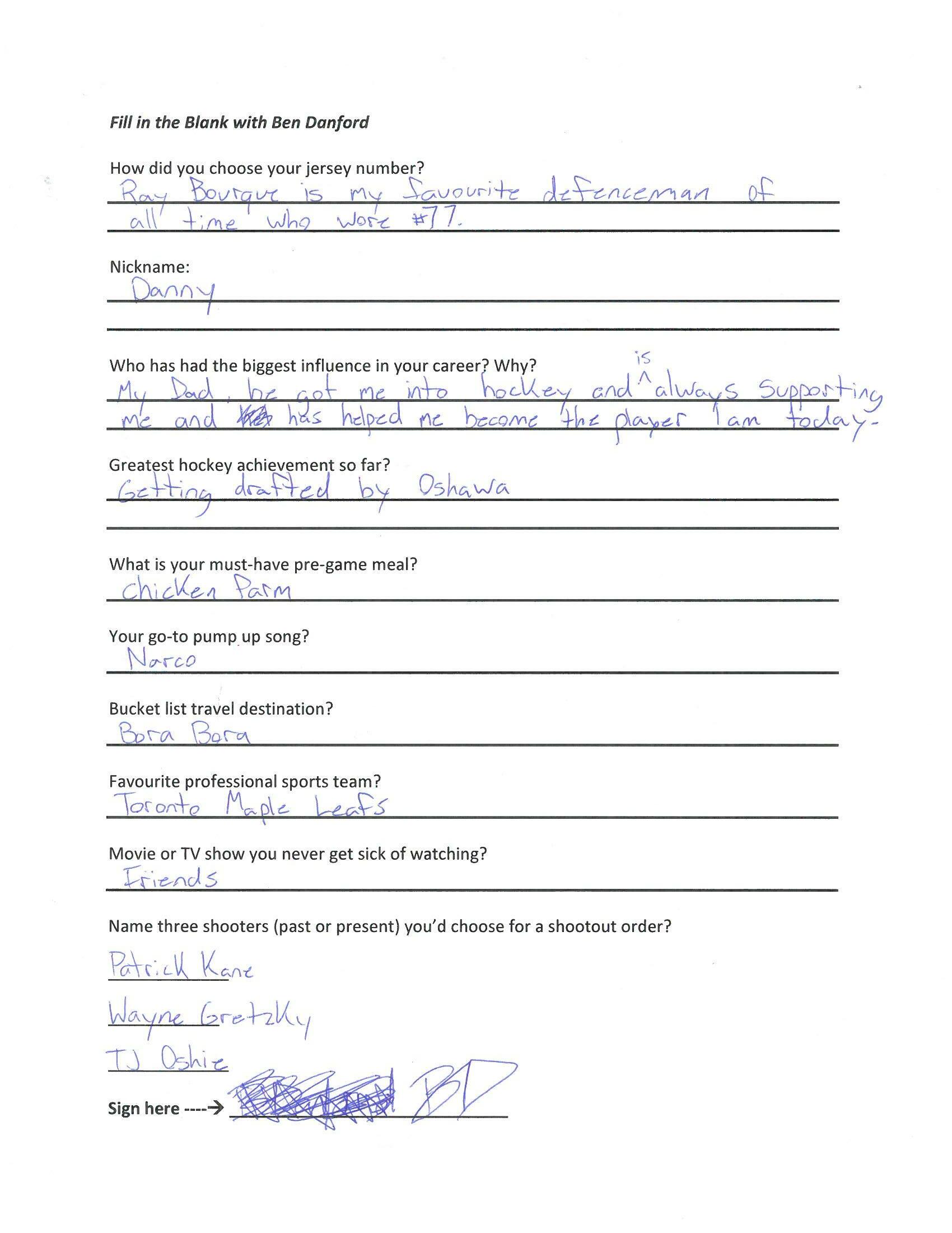 Danford is seen by many as a dependable offensive defenceman, taking enough of a risk to create scoring chances, but not jeopardizing his own zone to make the play. He joins a young back-end with the Oshawa Generals but is sure to create stability and dependability.