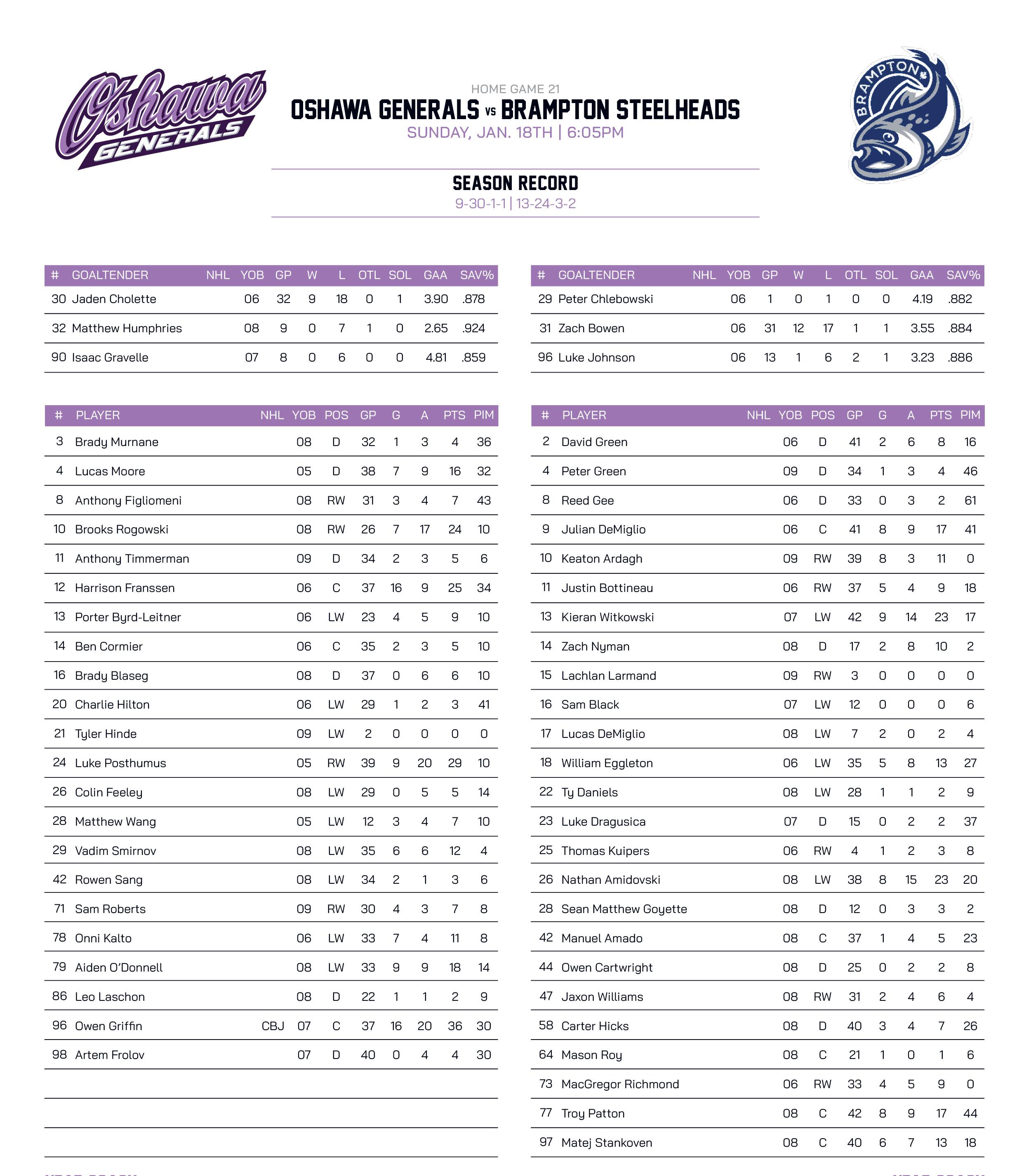 However, both sides come into this one looking for big wins to gain confidence in their games. The Generals do have Brampton’s number on home ice with six wins in the Steelheads’ last nine visits to the TCC.