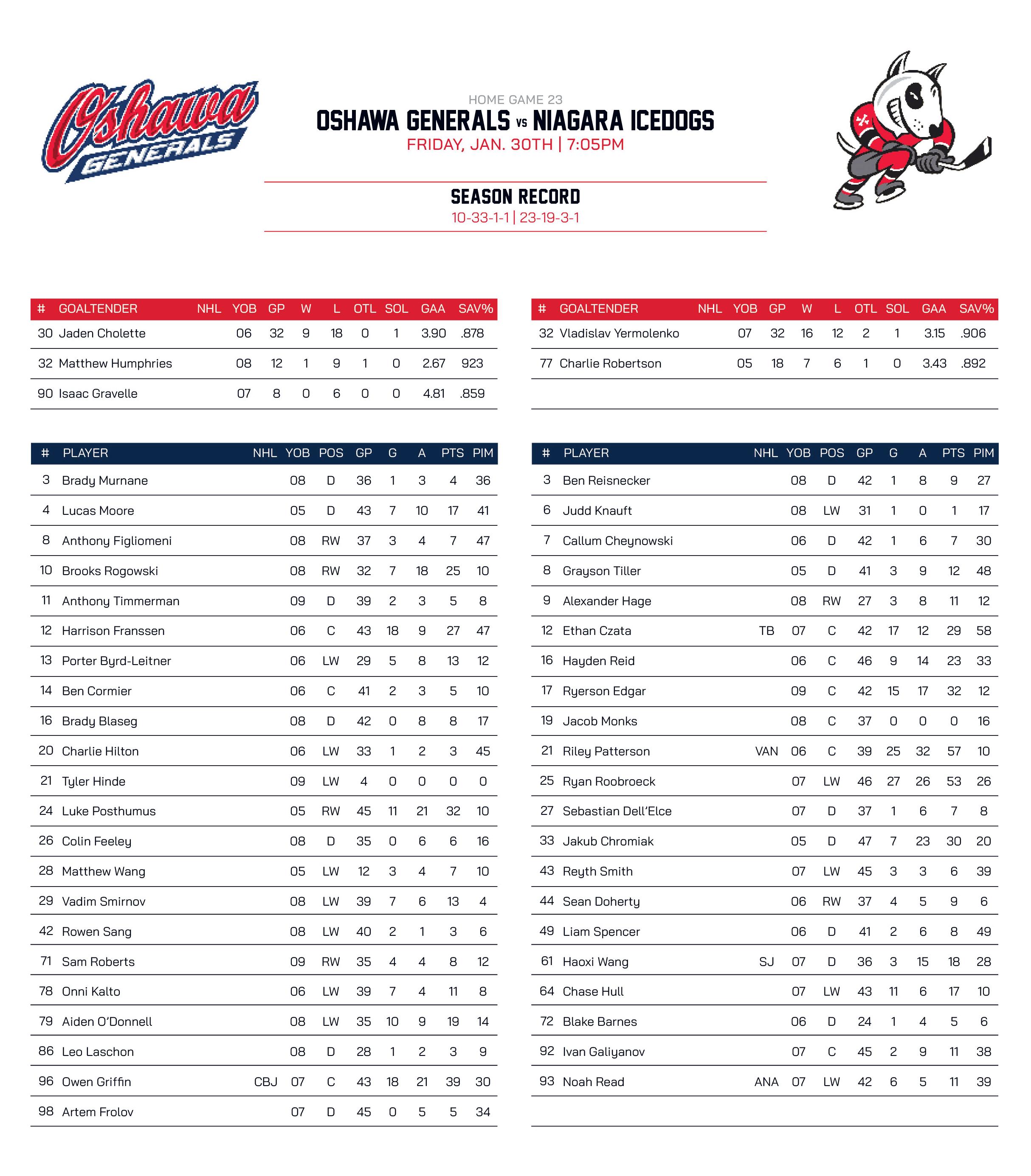 For the IceDogs, look out for their leading point man, Riley Patterson. The Generals know the Canucks’ prospect well from his years with the Barrie Colts, but he has been beyond fantastic since being acquired by Niagara in an offseason trade, tallying 57 points in 39 games with a combination of playmaking poise and an excellent release.