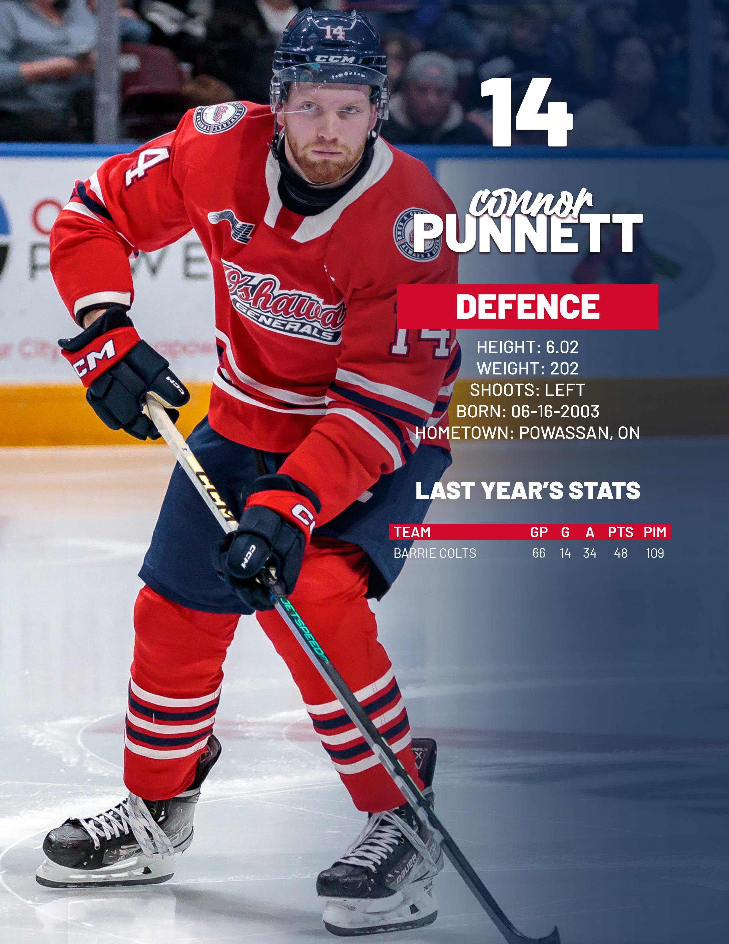 Connor Punnett: An over-age defenceman acquired from the Barrie Colts Punnett is a punishing presence at the back end not afraid to throw a big hit. Despite the intimidation factor, the defenceman is good with the puck picking up 36 points so far this season including six goals and 30 assists. Punnett spent parts of four seasons with the Colts after being traded from the Saginaw Spirit, he played 190 games for Barrie eventually dawning the C on his jersey.
