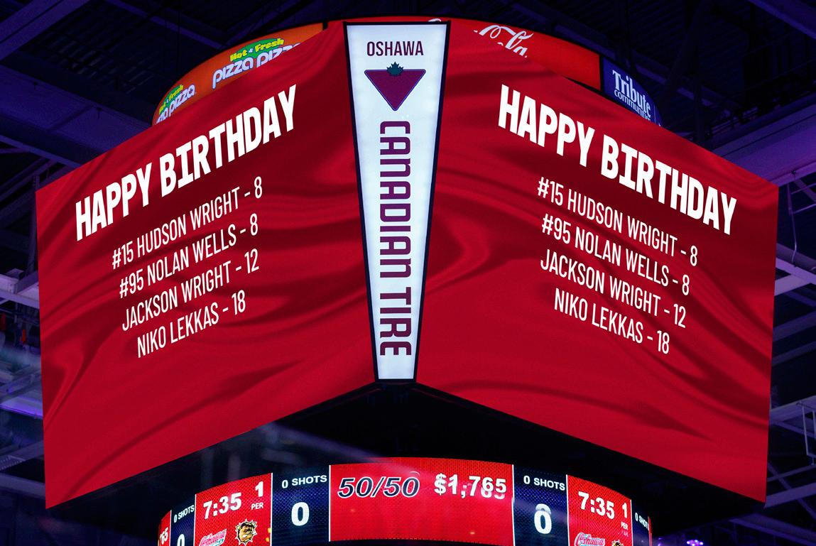 Are you or someone special celebrating your birthday with the Oshawa Generals? We’ve got the perfect way to celebrate! Request a birthday shoutout on our centre-ice videoboard. For a request to be guaranteed, it must be submitted 48-hours BEFORE scheduled puck drop. This means if a game is scheduled for a Friday night at 7:05 p.m., your birthday request needs to be submitted by Wednesday at 7:05 for it to be guaranteed.