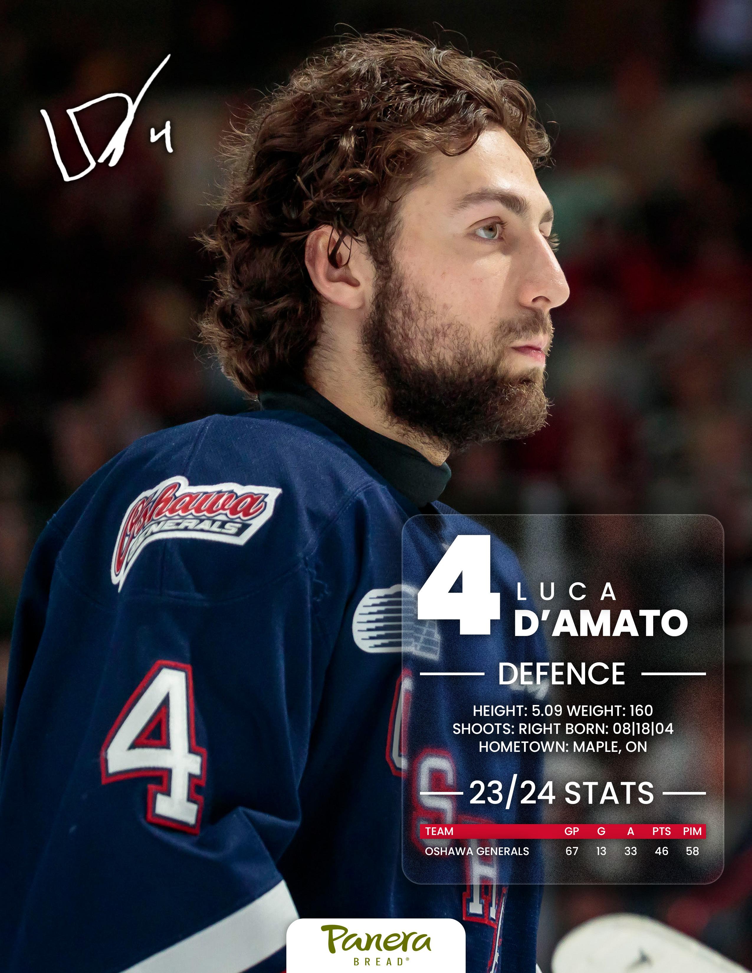 The third General to be taken in the 2024 NHL Draft, Luca Marrelli was selected 86th overall by the Columbus Blue Jackets. Marrelli made an immense mark with the team in the 2023-2024 season by leading all defencemen in scoring with 57 points in 67 games. Marrelli continued this scoring push in the playoffs, with 13 points in 21 games. Marrelli was the third General to attend the CHL Top Prospects game and this upcoming season will be his fourth with the Generals where his point totals seem to rapidly increase across each season.