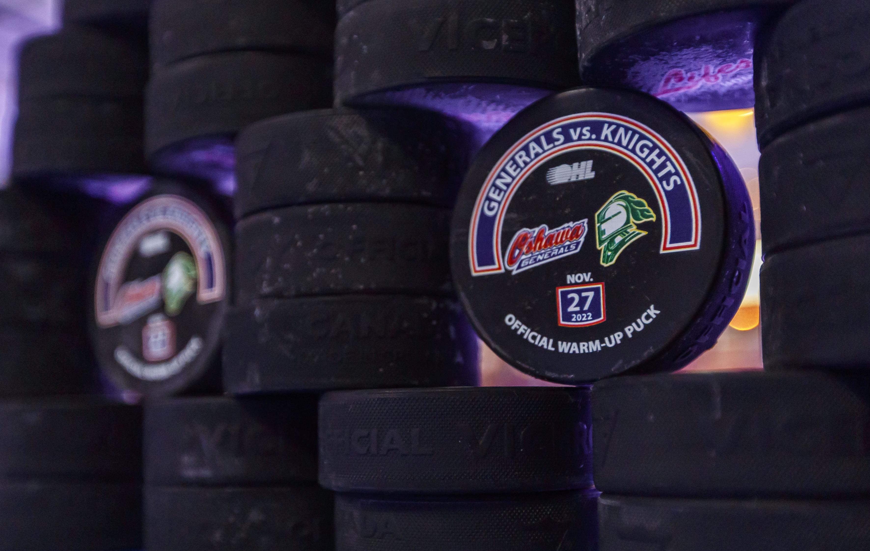 Every single Oshawa Generals home game is YOUR chance to bring home a piece of history. All 34 home games will feature unique warmup pucks specific to that night’s home game! While everyone rushes to the glass hoping their favourite player tosses one over, you can head to the back of section 112, or the Generals store inside Gate 1, after the warmup and grab your own puck fresh off the ice for just $10 dollars!
