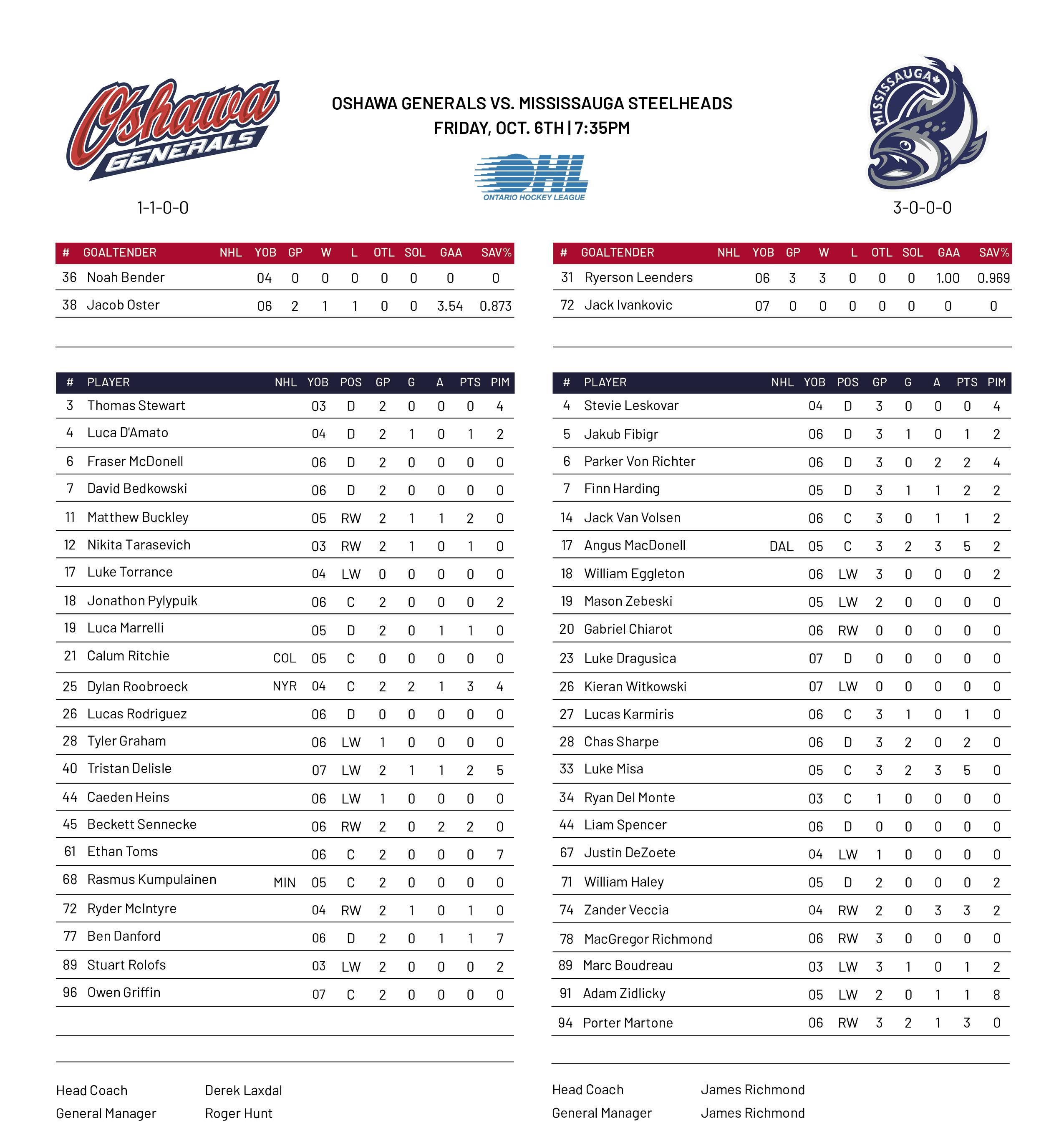 All three of the Generals goals from that game, came from players who have since graduated out of the OHL - two from Cameron Butler and one from Ryan Gagnier. Mississauga’s goal scorers were Angus MacDonell and Zander Veccia, both of which are currently in their team’s top-five scorers in 2023-2024.