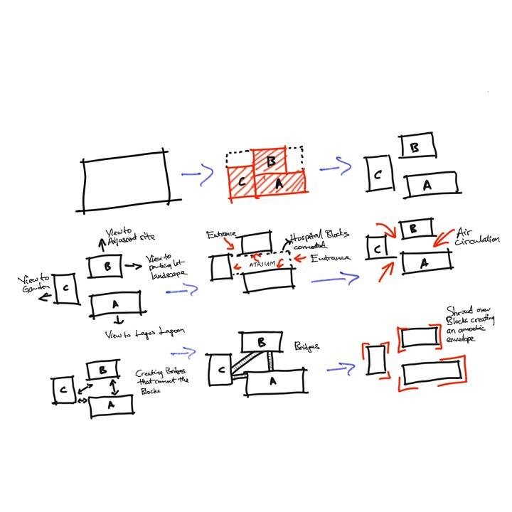 The hospital massing is derived from a single volume divided into three parts to improve breathability, daylight access, and environmental performance. The resulting voids and shaded transitions reduce bulk while enhancing airflow and user comfort.
