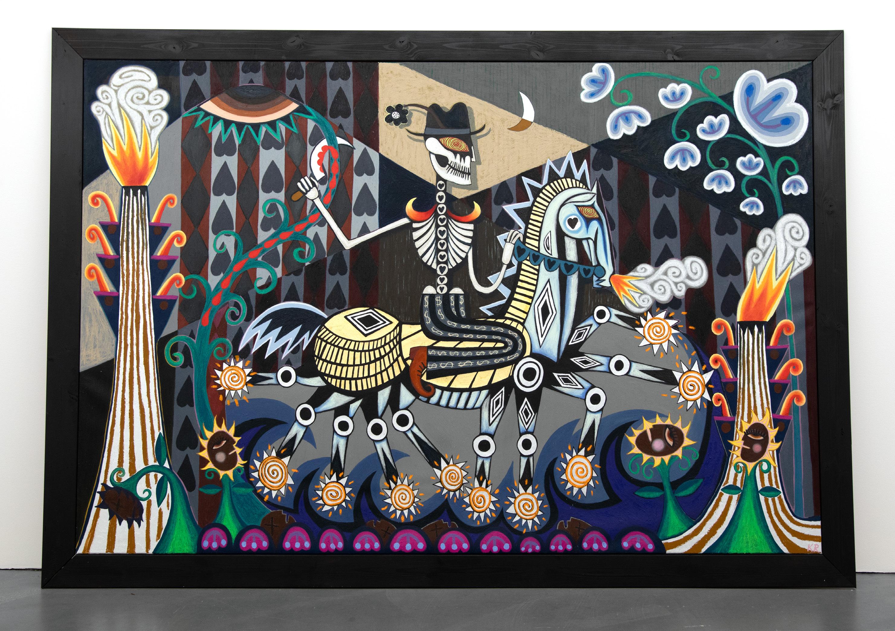 Krista Rosenkilde är en självsäker och lekfull historieberättare –hennes målningar är fyllda av folkloristiska figurer, ornament och mönster. Hon målar med precision i en färgstark och fantasifull stil som ofta förstärks med taktila element som sand, bladguld och pärlor i färglagren och voluminösa, skulpturala tavelramar.