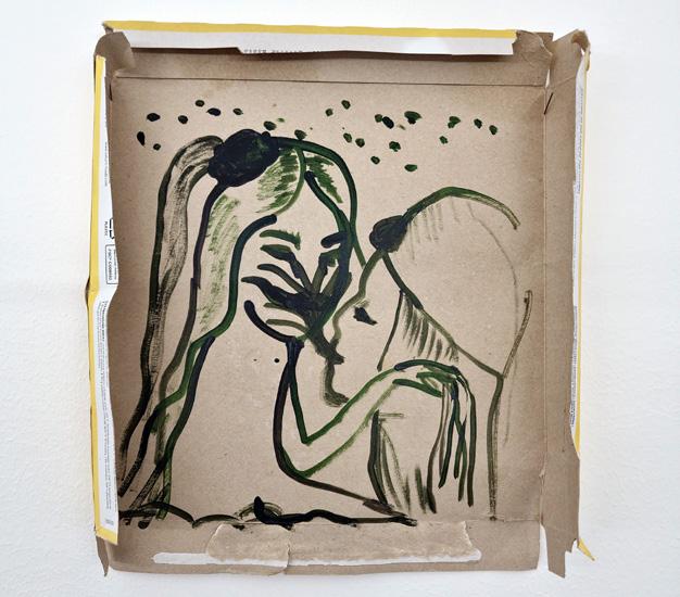 och teknikerna helt olika varandra. Men vad eller vem är det som vi möter i verken? Det är precis lika brokigt. Korset, den urgamla symbolen som är känd ända från 2000 f.Kr. är ett återkommande tema i Wæhrens pappersarbeten, medan Bagala, Mørkeberg och Thorhauge visar oss den nakna kvinnokroppen, ett favoritmotiv sedan antiken. En hund ligger i knät, en häst galopperar, en tiger omringar en sovande kvinna, fjärilar flyger i formation, tre duvor söker kontakt och en orm i Støvrings verk slingrar sig i öglor utan att kunna komma undan, medan ett skelett med bowlerhatt helt enkelt rider genom Rosenkildes surrealistiska landskap. I Gernilds storskaliga verk är det svårare att tydligt identifiera motivet. Kanske två lökar, en vas och några flyktiga blomblad som tycks ha rymt från vasen för att slå rot i den verkliga jorden. Och här blir det ironiskt nog tydligt att många av verken faktiskt är fyllda med blommor, träd, frukter och växter – allt vad moder jord ger oss. Låt oss dröja kvar vid all den vackra växtligheten en stund, för naturen har ju sin plats hos Gernild, Mørkeberg, Støvring, Rosenkilde och Thorhauge. Men kanske är den också lite olycksbådande, precis som när de kvinnliga konstnärerna i det moderna genombrottet inte bara målade doftande rosor och vackra pioner, utan också tistlar, nässlor och flugsvampar. Och inte ens i dag är allt idylliskt, det är något som händer mitt i natten i fullmånens sken, en kvinna har sjunkit ner i marken trots att hon verkar balansera lätt på en fot och med armarna i luften, träd har fattat eld och mystiska äpplen hänger i ett träd med bara skalet som vrider och vänder sig i en spiral.