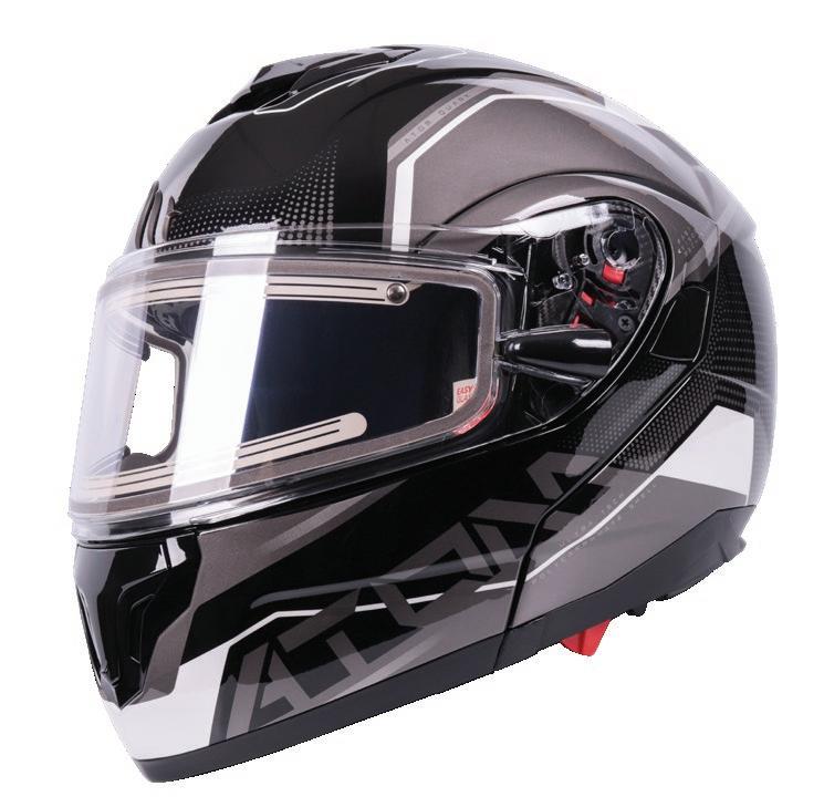 The Atom SV is the ultimate helmet for long-distance snowmobilers. Includes breath guard and amber inner visor. Available with double or electric quick-release shield. Also includes a quick release micrometric buckle and a removable/washable lining.