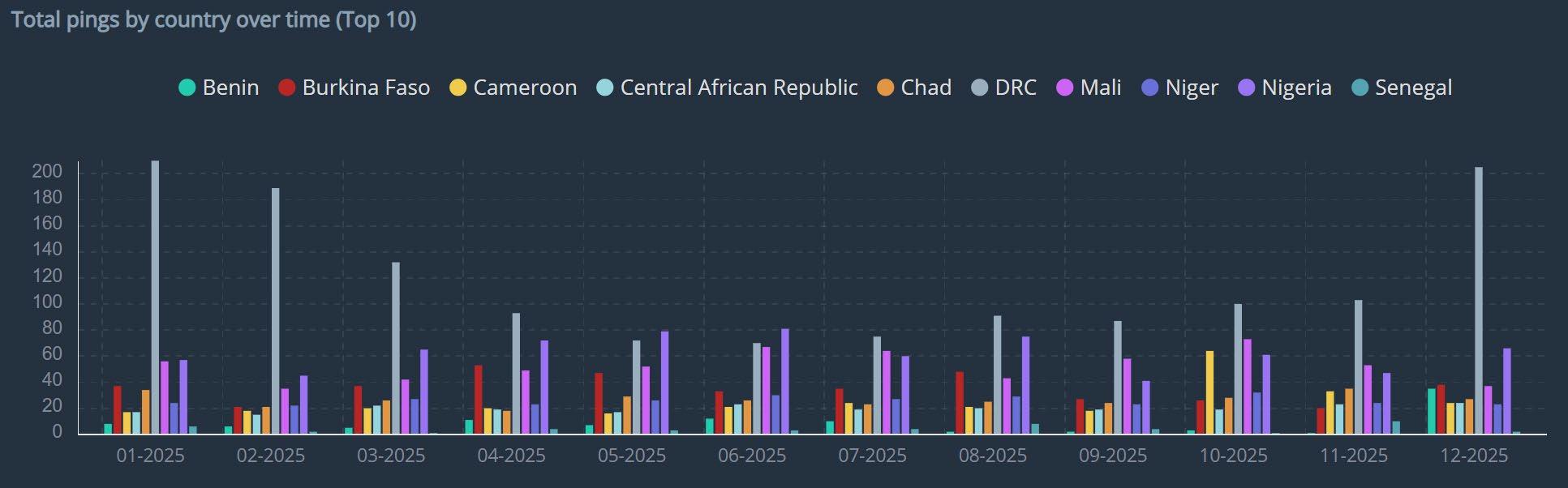 Osprey recorded a total of 4,823 incidents in the WACAF region during 2025 The top three countries by numbers of incidents were Democratic Republic of Congo (DRC) (1,427), Nigeria (749) and Mali ( 629)