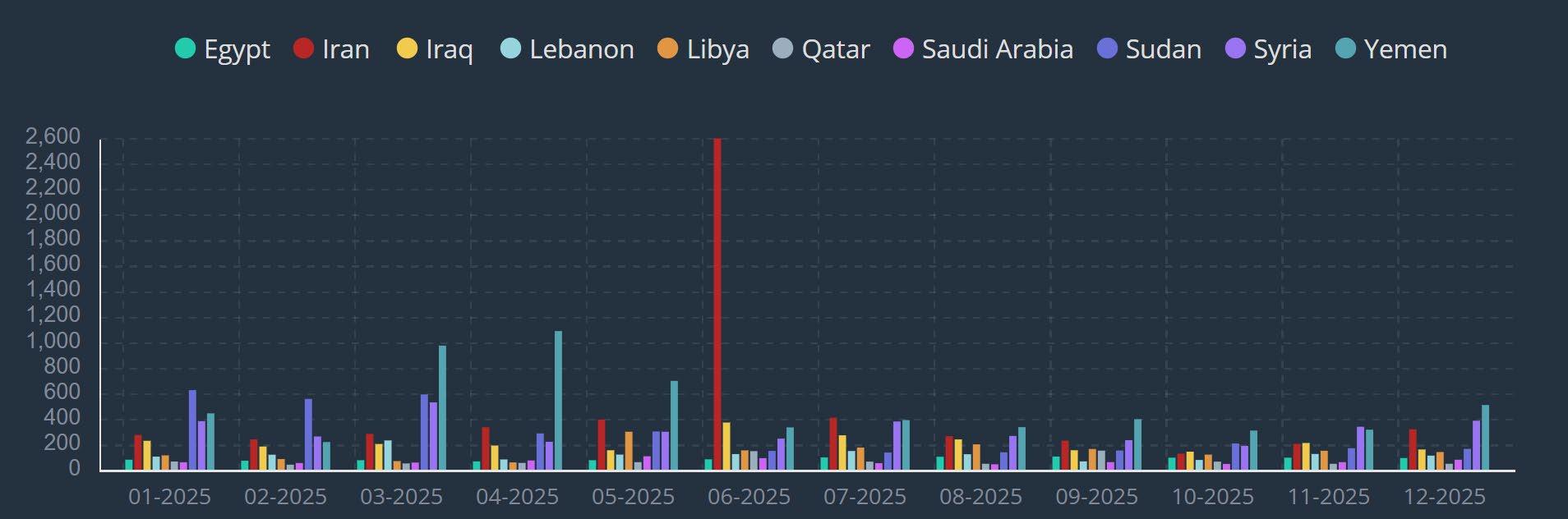Osprey recorded a total of 29,872 incidents in the MID region during 2025 The top three countries by number of incidents were Yemen ( 6,100), Iran ( 5 ,764) and Syria ( 3 ,822)