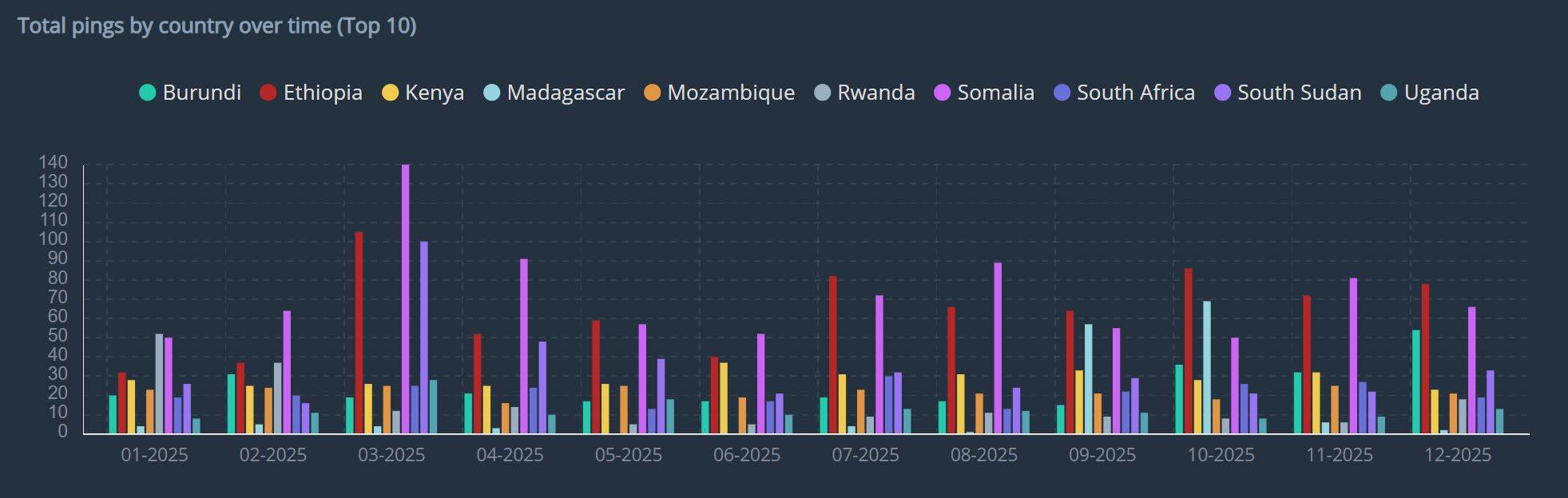 Osprey recorded a total of 4,236 incidents in the ESAF region during 2025. The top three countries by number of incidents were Somalia ( 867), Ethiopia ( 773) and South Sudan ( 411).