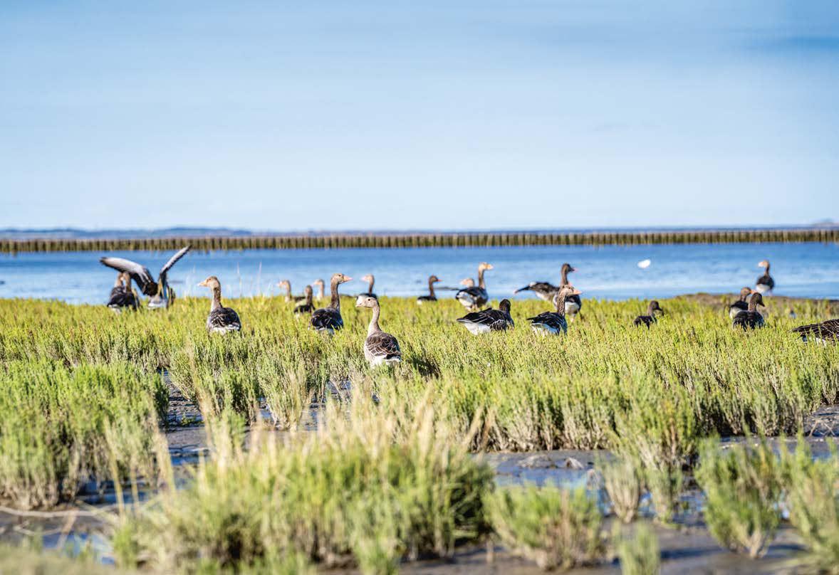 Auch für die Zugvögel sind die Salzwiesen ein wichtiger Ort. Sie machen hier Rast, überwintern hier und bedienen sich an dem reichhaltigen Angebot. Bodenbrüter wie Austernfischer und Rotschenkel können hier ungestört ihre Nester anlegen.