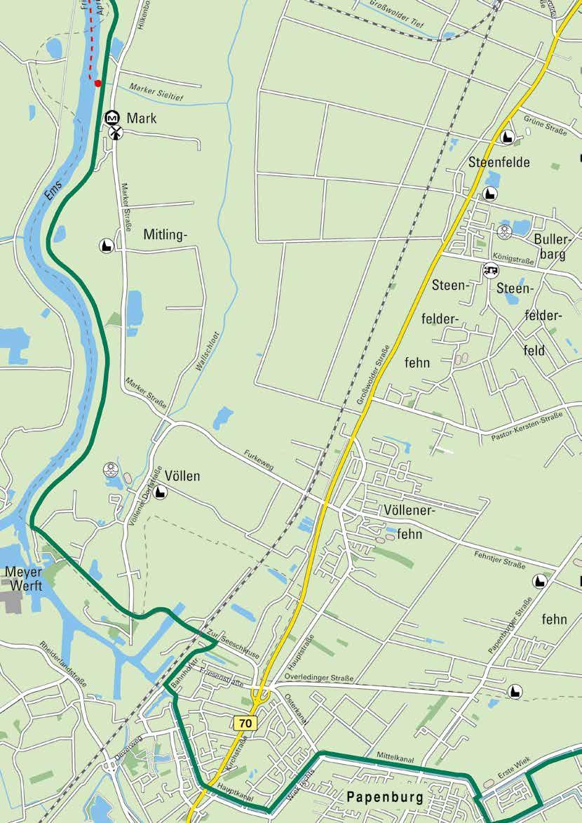 Nach kurzer Fahrstrecke biegen Sie rechts ab in zur „Collinghorster Straße” schafft. Hier geht es rechts ab. Nach etwa 700 Metern biegen Sie dann links und fahren Sie auf der „Idehörner Straße” bis „Breinermoorer Straße” bis zur 70. Überqueren Sie diese Straße und fahren an der Mülldeponie vorbei auf dem „Lüdeweg” weiter. Biegen Sie dann an der zweiten Straße rechts „Zu den Höfen I” ein. Überqueren Sie die Gleise und fahren links ab am Bahndamm entlang. Fahren Sie geradeaus weiter über den „Conrebbersweg” bis zur „Deichstraße”. Hier geht es rechts ab. Nach kurzer Strecke erreichen Sie links die Straße „Wes Ende und biegen dort links in die Straße „Veendyk” ein. Nachdem Sie die Gleise überquert haben, geht