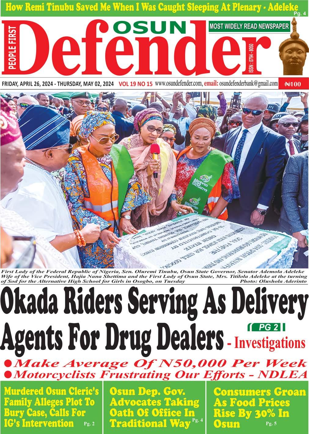 FRIDAY, APRIL 26, 2024 - THURSDAY, MAY 02, 2024 VOL. 19 NO 15 www.osundefender.com, email: osundefenderbank@gmail.com Olufi Suspends Three Chiefs Over Gross Misconduct Pg. 6 OSUN DEFENDER is published by Moremi Publishing House Limited, Promise Point Building, Opposite Guaranty Trust Bank (GTB), Gbongan Road, Osogbo, State of Osun. All correspondence to the Deputy Editor, ISMAEEL UTHMAN, Telephone: 0809-301-9152. ISSN: 0794-8050. Website: www.osundefender.com Email: osundefenderbank@gmail.com, osundefender@yahoo.com News ISSN 07948050