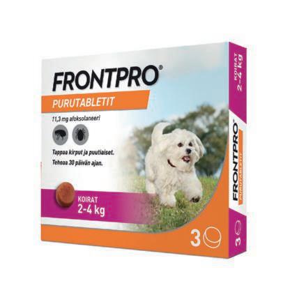 HELPPO ANTAA, MYÖS ILMAN RUOKAA Frontpro (afoksolaneeri) purutabletit koirien ulkoloisia vastaan. Käyttöaiheet: Koiralle puutiais- ja kirpputartuntojen hoitoon. Vaikutus: Yksi hoitokerta tappaa puutiaiset enimmillään yhden kuukauden ajaksi. Koiran kirpputartuntojen hoito vähintään 5 viikon ajan. Haittavaikutukset: Neurologisia oireita (kouristuksia, ataksiaa ja lihasvapinaa), kutinaa, letargiaa, ruokahaluttomuutta ja lieviä maha-suoli-kanavan vaikutuksia (oksentelua, ripulia) on raportoitu hyvin harvoin. Raportoidut haittavaikutukset olivat useimmiten lyhytkestoisia ja menivät itsestään ohi. Voidaan käyttää kaikenrotuisille koirille, myös collieille. Tiineys ja laktaatio: Voidaan käyttää tiineillä, imettävillä ja siitokseen käytettävillä nartuilla. Käyttöön liittyvät erityiset varotoimet: Alle 8 viikon ikäisille pennuille ja/ tai alle 2 kg:n painoisille koirille vain eläinlääkärin arvion perusteella. Pakkauskoot ja annostelu: Pakkauksessa kolme purutablettia. 11 mg; 2–4 kg, 28 mg; > 4–10 kg, 68 mg; > 10–25 kg ja 136 mg; > 25–50 kg. Yli 50 kg:n painoisille koirille annetaan tarkoituksenmukainen yhdistelmä eri-/samanvahvuisia purutabletteja. Myyntiluvan haltija: Boehringer Ingelheim Vetmedica GmbH Markkinoija: Vetcare Oy, Helsinki. TUTUSTU HUOLELLISESTI PAKKAUSSELOSTEESEEN ENNEN LÄÄKKEEN KÄYTTÖÄ. 1.2026