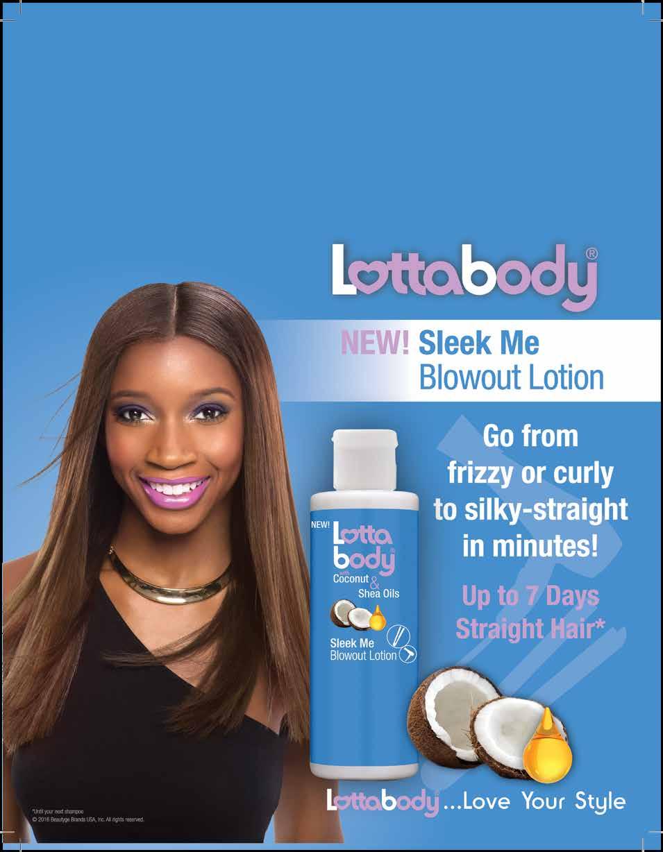 From ringing in the New Year, all the way through Valentine’s Day, your customers can feel confident that their hair is fabulous with Lottabody’s new Sleek Me Blowout Lotion. They can easily take their hair from frizzy or curly to silkystraight in just minutes, and the resulting straight style lasts up to 7 days! Learn more on page 59. www.lottabody.com
