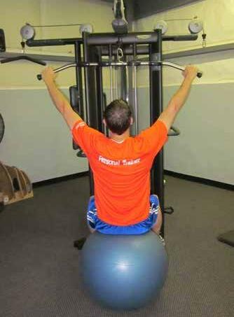 Whether you use a Fitball or not, the start position should look like Figure 1. A wide, overhand grip (as opposed to underhand used for a chin-up) should be utilized with your upper body slightly leaned back. Keep good posture and don’t let your lower back “round out”. Pull the bar down toward the upper chest – Figure 2. A common mistake is to pull the bar down past the chest into the lap. If you can do this before the weight stack hits the top, you need to select a heavier resistance.
