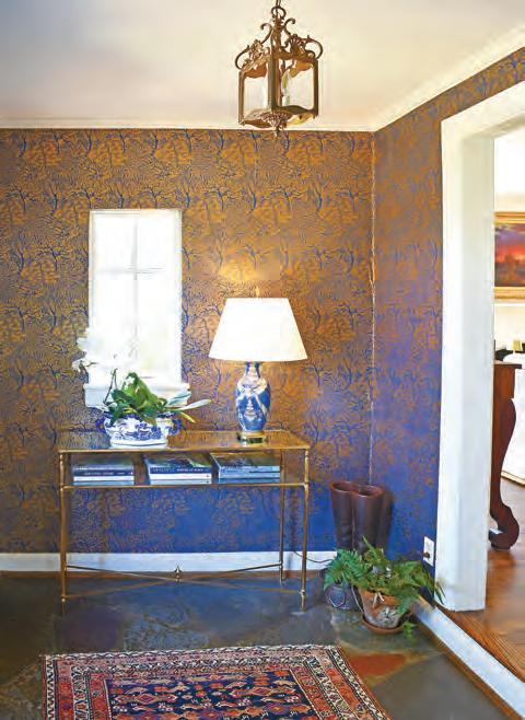 below: The foyer sets the tone as you enter the Bethea home with blues you see in a dark blue and metallic wallpaper and with the slate floor original to the home.