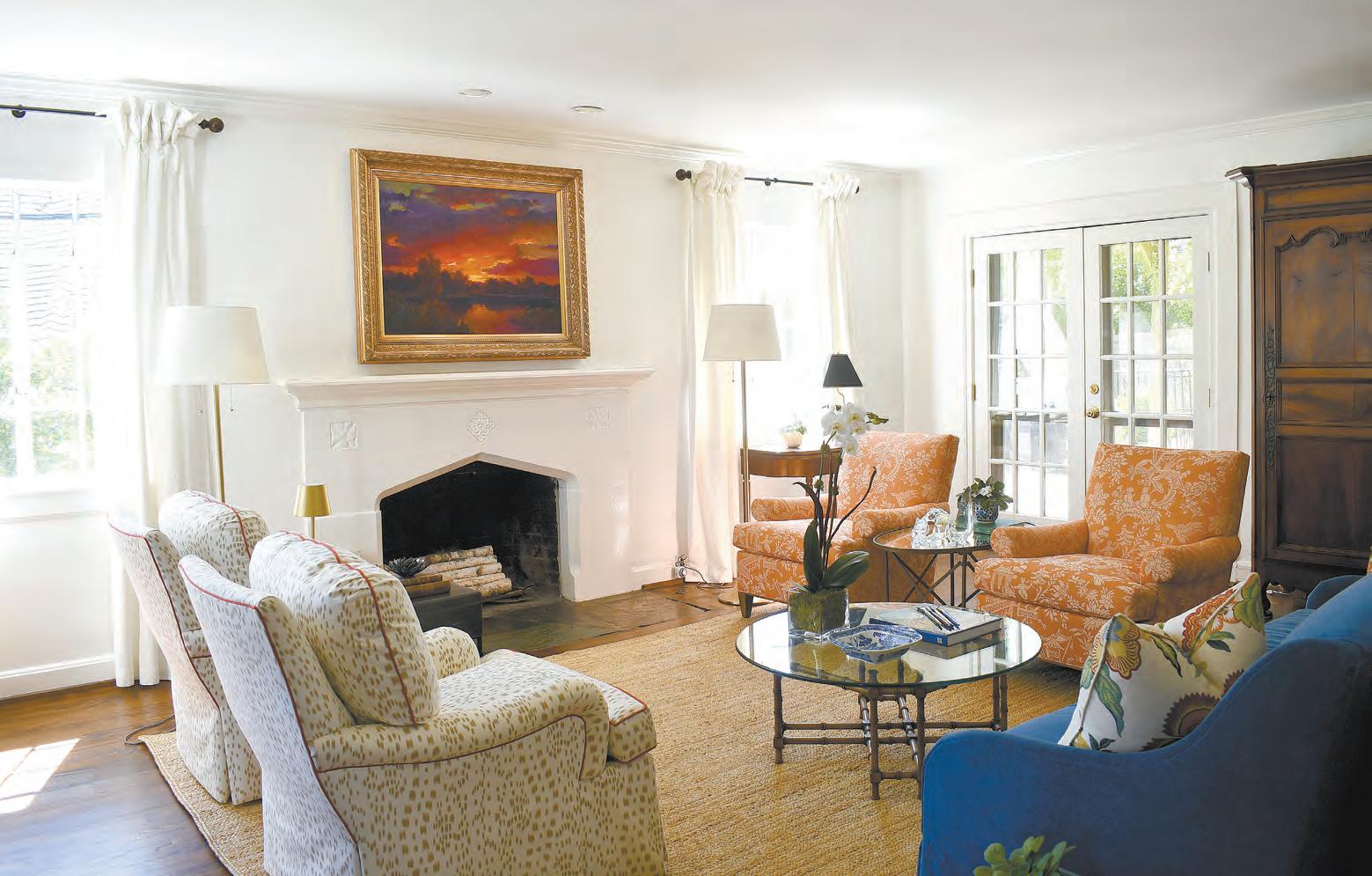 Betheas have collected on their travels over the years. Most strikingly, a landscape with the bold pinks and oranges of a sunset by artist Ovanes Berberian commands the living room from over the fireplace, and Pat Hiden Interiors pulled colors from the painting to select upholstery for chairs and couch pillows that face it. Barbara Evans, a local artist and friend of the Betheas, painted a landscape of a lake that faces the fireplace from over a navy couch.