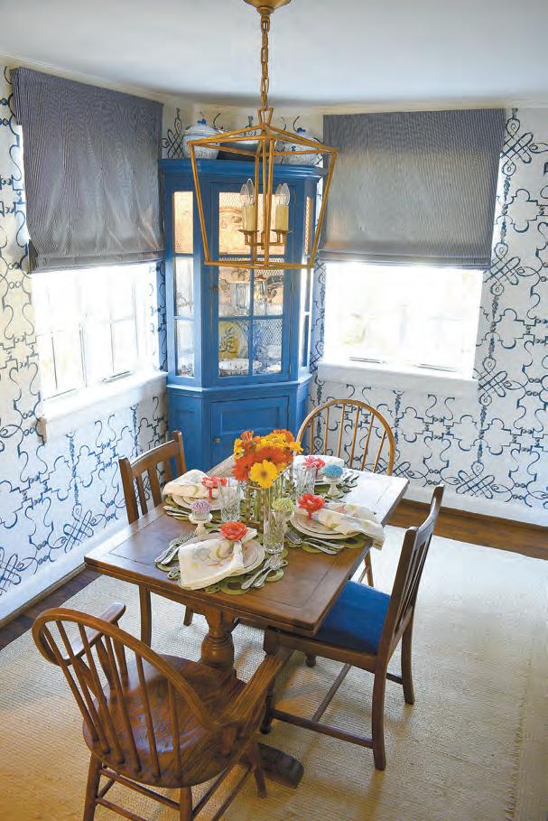 right: The Betheas recently added a blue and white patterned wallpaper to their breakfast room and selected shades and painted a corner cabinet to match.