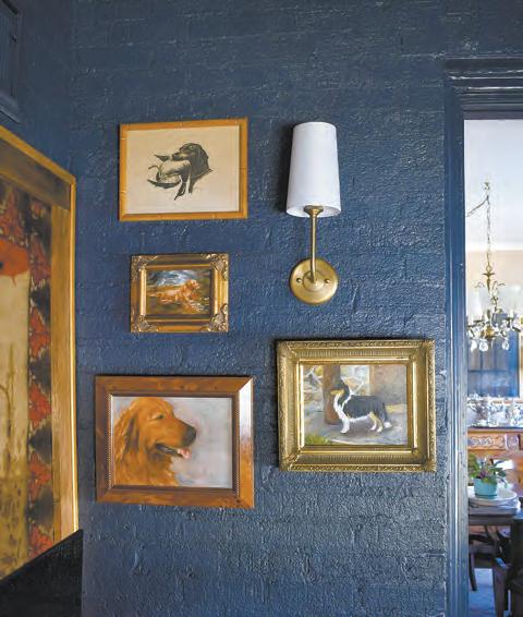 living space off the living room where the couple spends a lot of their time. While, like most rooms in the house, it’s seen a lot of paint colors over the years, today a dark blue, Hale Navy by Benjamin Moore, backgrounds a set of paintings of golden retrievers and collies as well as a horse painting by local artist Dirk Walker (fitting, since the Betheas have had a golden retriever and a collie since they moved into the home, and Tumpy has a horse).