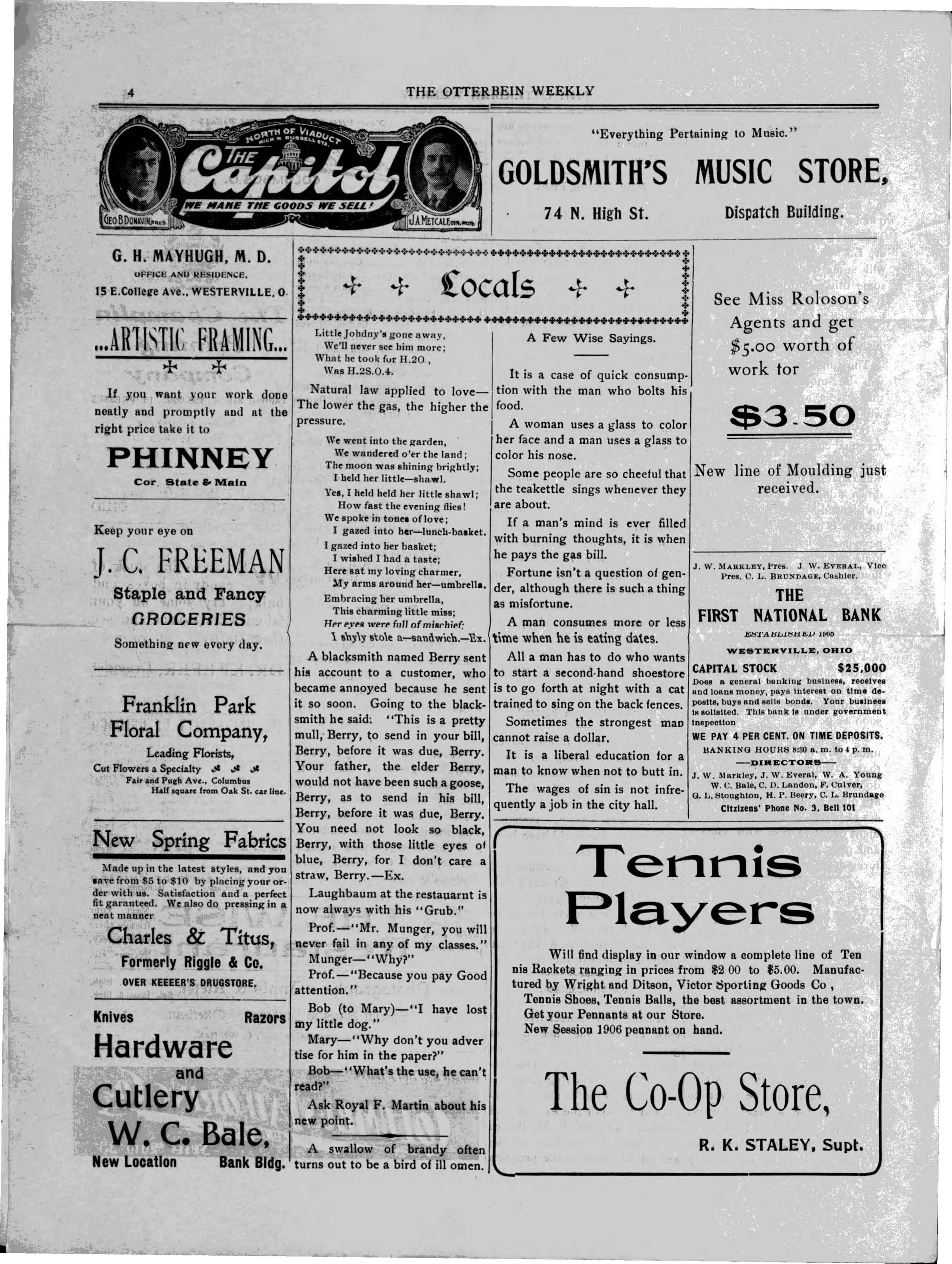 THE OTTERBEIN WEEKLY "Everything Pertaining to Music." 4 GOLDSMITH'S MUSIC 7 4 N. High St. l J I +•I l t ++++ t f t ++•l"l•of +++•Jo 11 I< i G. H. MAYHUGH, M. D. OFFICE AND ~ESIOENCE, 1S E Cotleare Ave., WESTERVILLE o. i + + (oca(s + + j tlllt•+11++1•r1+1•++•r++++••······••o1••·········••+++ ... AR1l~TIC FRAMING... LittleJohdny'sgone away, We'll never see him more ; A Few Wise Sayings. What be too le fvr H 2O , Was B.2S.O 4. It is a case of quick consumpIf you want yonr work done Natural law applied to love- I tion with the man who bolts his neatly and promptly and at the right price take it to PHINNEY Cor State• Main Keep your eye on J. C. FREEMAN Staple and Fancy GROCERIES Something new evory day. • Franklin Park Floral Company, Leading Florists, Cut Flowers a Specialty .JA .JA .JA Fair and Purh Ave., Columbus Half 1quan from Oak St ear line. New Spring Fabrics I. Made up in the latest styles, and you I eave from $5 to $10 by placing your order with us. Satisfaction and a perfect fit garanteed. We also do pressing in a neat manner Charles & Titus, Formerly Riggle & Co. OVER KEEEER'S DRUGSTORE, Knives Razors Hardware and ryG B ) . • a e, New Location Bank Bldg.