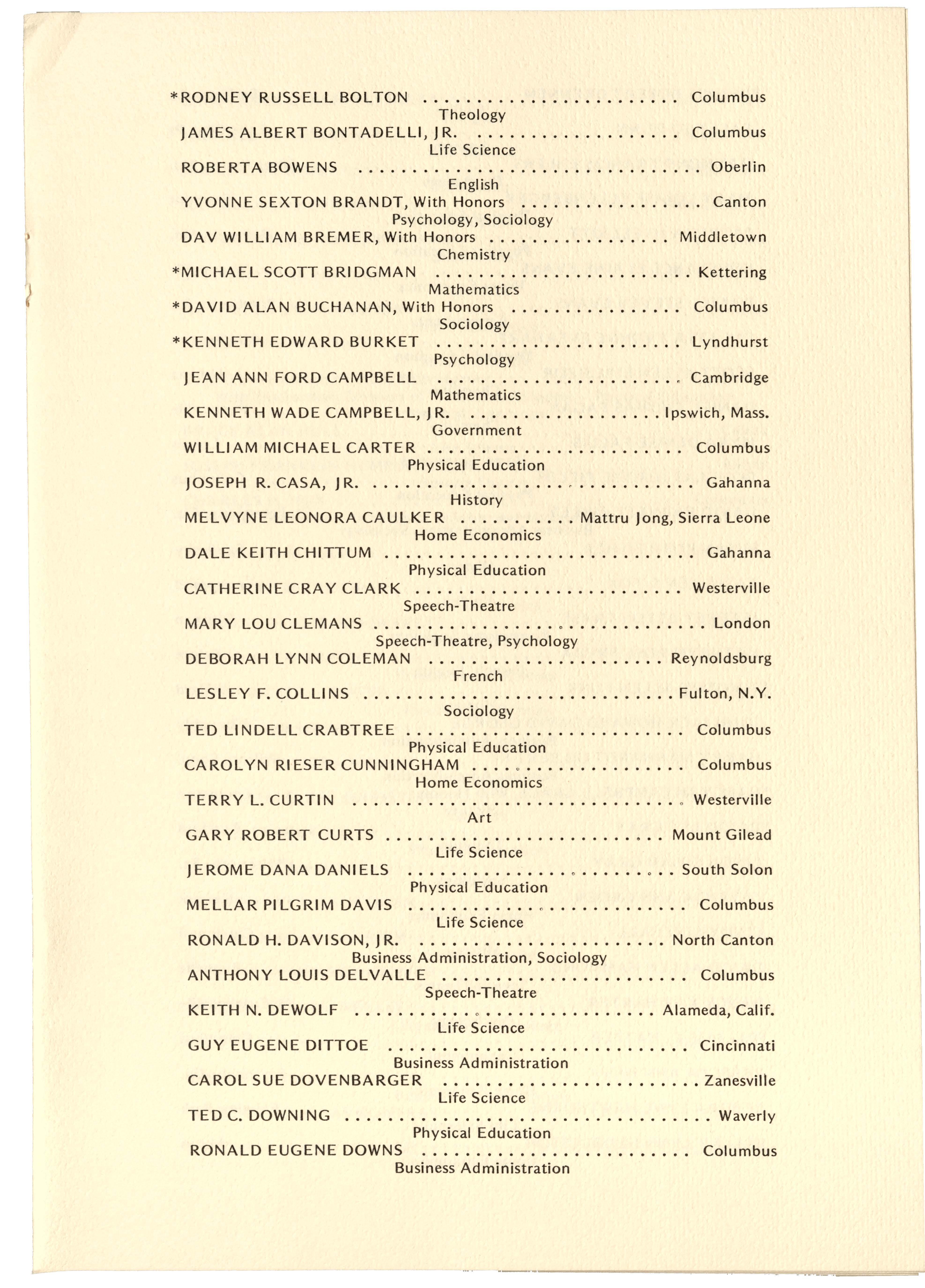 Because of his qualities as a distinguished teacher, author and scholar, Otterbein College takes pleasure in awarding the degree of Doctor of Humane Letters to Dr. John Ruskin Howe, '57.