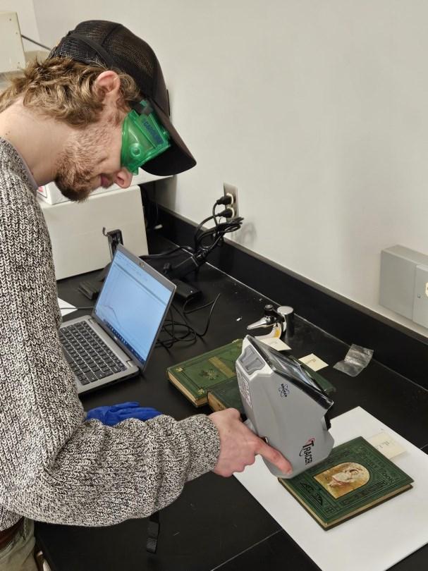 Students in an upper-level spectroscopy course have used it to study the composition of ancient and modem coins and in their course capstone projects. For Owen '24, worked with librarian Shannon KupferTrausch of the State of Ohio to analyze a subset of 19 century studies the Poison Book Project shown some book covers were made with Emerald Green, a toxic arsenic compound. Luckily, none of green-covered Owen studied with contain arsenic; they likely are made with chrome yellow.