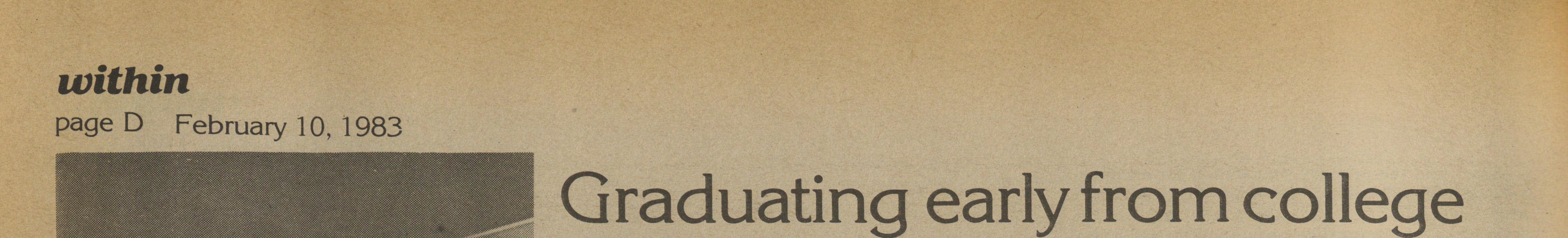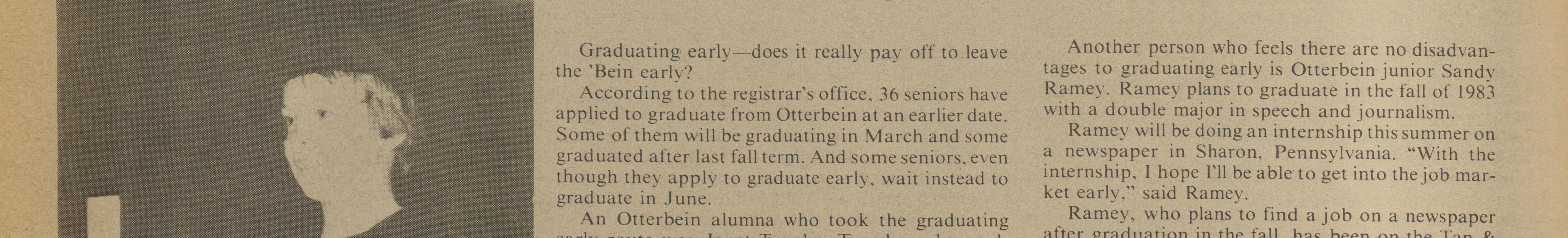 Another person who feels there are no disadvantages to graduating early is Otterbein junior Sandy Ramey. Ramey plans to graduate in the fall of 1983 with a double major in speech and journalism. Ramey will be doing an internship this summer on a newspaper in Sharon, Pennsylvania. "With the internship, I hope I'll be able to get into the job market early." said Ramey.