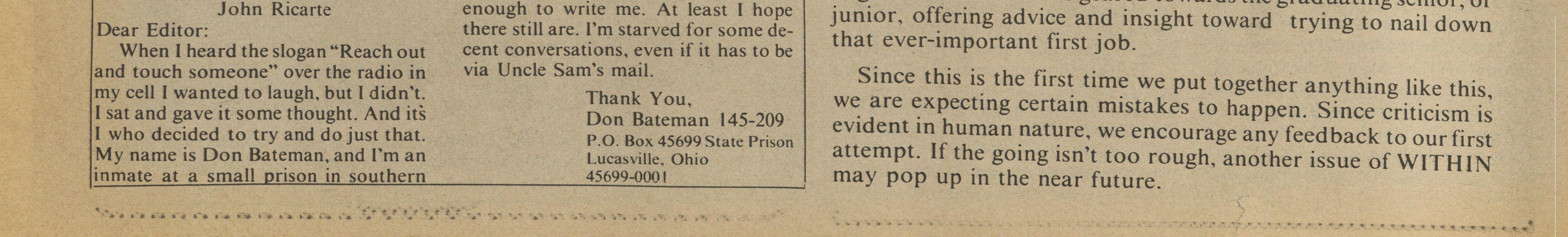 When I heard the slogan "Reach out cent conversations, even if it has to be and touch someone" over the radio in via Uncle Sam's mail. my cell I wanted to laugh, but I didn't. Thank You, l sat and gave it some thought. And its Don Bateman 145-209 l who decided to try and do just that. P.O. Box 45699 State Prison