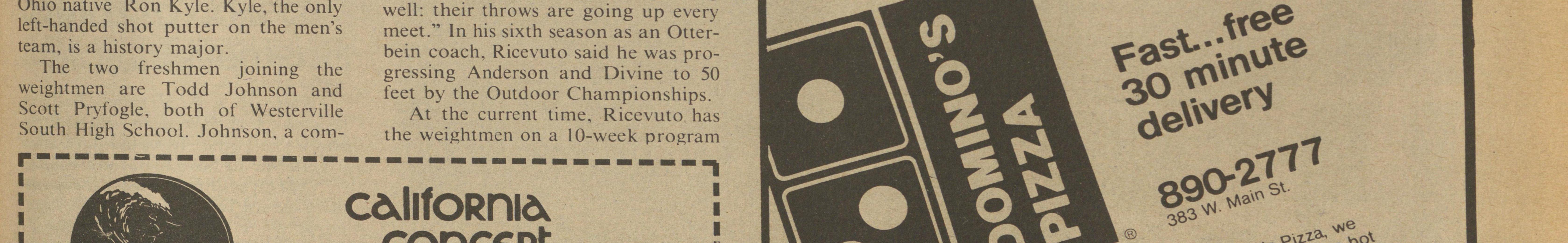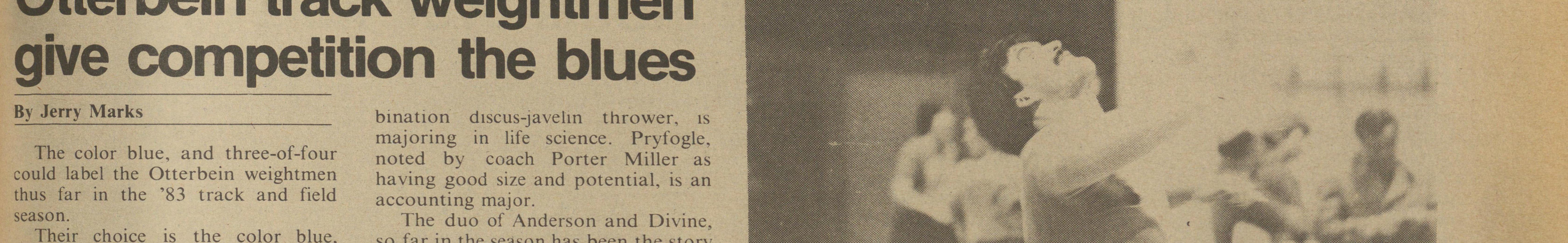 The color blue, and three-of-four noted by coach Porter Miller as could label the Otterbein weightmen having good size and potential, is an thus far in the '83 track and field accounting major. season. The duo of Anderson and Divine, Their choice is the color blue, so far in the season has been the story though they didn't signify whether in O.A.C. shot put events. In three of blue was their visual favorite, or the the four meets in the indoor season the mental color they want their opposi Otterbein shot putters have taken the tion to feel, when competing against top two places in their meets. Last the Cardinal shotputters. weekend at the O.W U. Relays, the