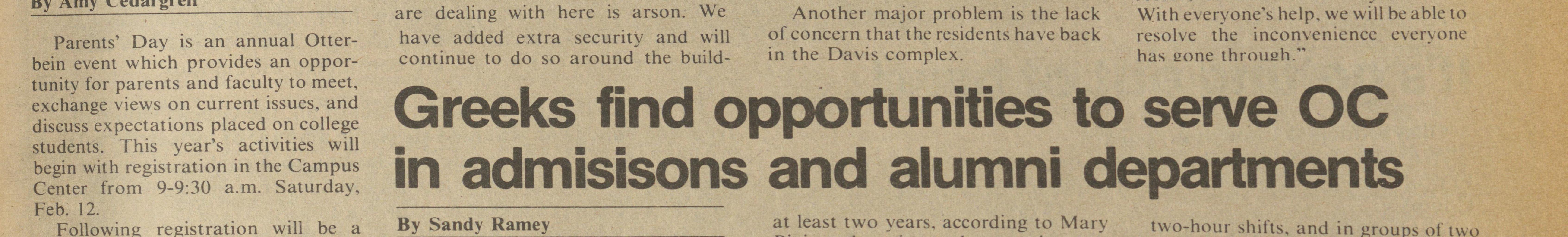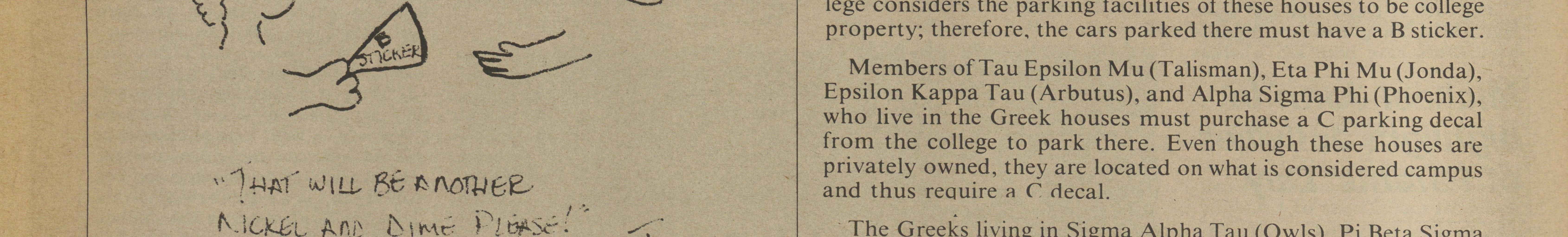 Student Personnel may find it best to devise yet another parking decal. (Possibly a G decal for Greek.) This decal could be offered to the college-owned Greek house residents for a minimal fee (perhaps the same price as a C decal) which would cover the cost involved in simply providing a parking lot. Those residents of Greek houses which are on campus should be offered the G sticker free of charge since the college provides neither the lot or any service.