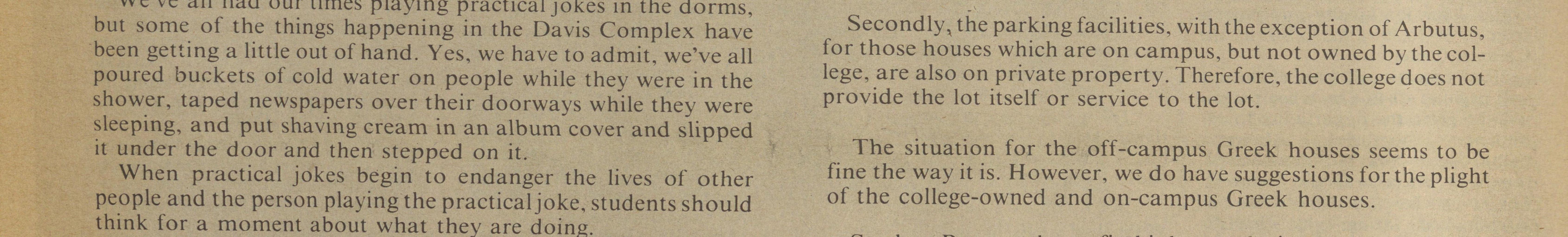 We've all had our times playing practical jokes in the dorms, but some of the things happening in the Davis Complex have been getting a httle out of hand. Yes, we have to admit, we've all poured buckets of cold water on people while they were in the shower, taped newspapers over their doorways while they were sleeping, and put shaving cream in an album cover and slipped 1t under the door and then stepped on it.