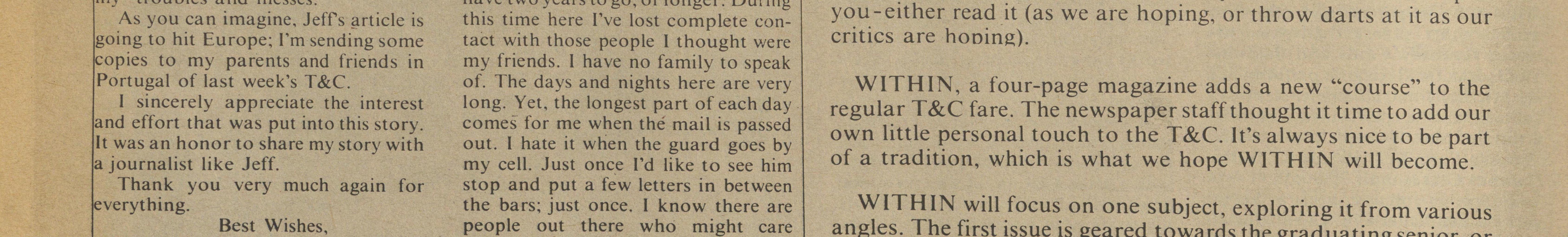 WITHIN, a four-page magazine adds a new "course" to the regular T &C fare. The newspaper staff thought it time to add our own little personal touch to the T &C. It's always nice to be part of a tradition, which is what we hope WITH IN will become.