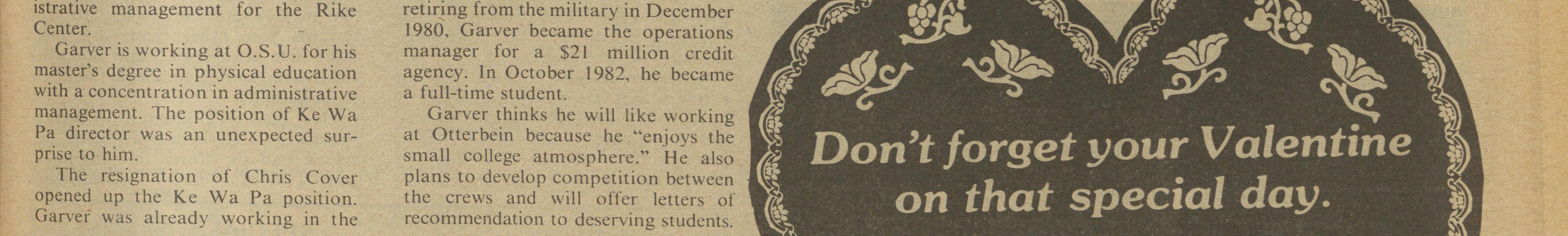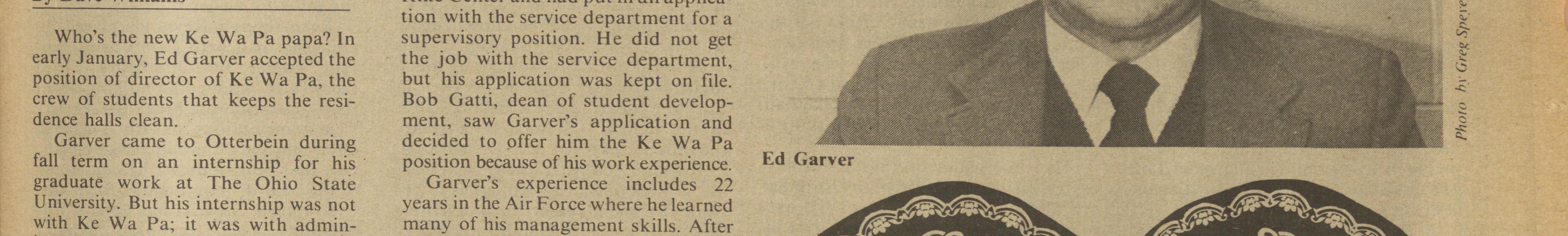 By Dave Williams Rike Center and had put in an application with the service department for a Who's the new Ke Wa Pa papa? In supervisory position. He did not get early January, Ed Garver accepted the the job with the service department, position of director of Ke Wa Pa, the but his application was kept on file. crew of students that keeps the resi Bob Gatti, dean of student developdence halls clean. ment, saw Garver's application and Garver came to Otterbein during decided to offer him the Ke Wa Pa fall term on an internship for his position because of his work experience. Ed Garver graduate work at The Ohio State Garver's experience includes 22 University. But his internship was not years in the Air Force where he learned with Ke Wa Pa; it was with admin many of his management skills. After istrative management for the Rike retiring from the military in December Center. 1980, Garver became the operations Garver is working at 0. S. U. for his manager for a $21 million credit master's degree in physical education agency. ln October 1982, he became with a concentration in administrative a full-time student. management. The position of Ke W a Garver thinks he will like working Pa director was an unexpected sur at Otterbein because he "enjoys the prise to him. small college atmosphere." He also The resignation of Chris Cover plans to develop competition between opened up the Ke Wa Pa position. the crews and will offer letters of Garver was already working in the recommendation to deserving students.