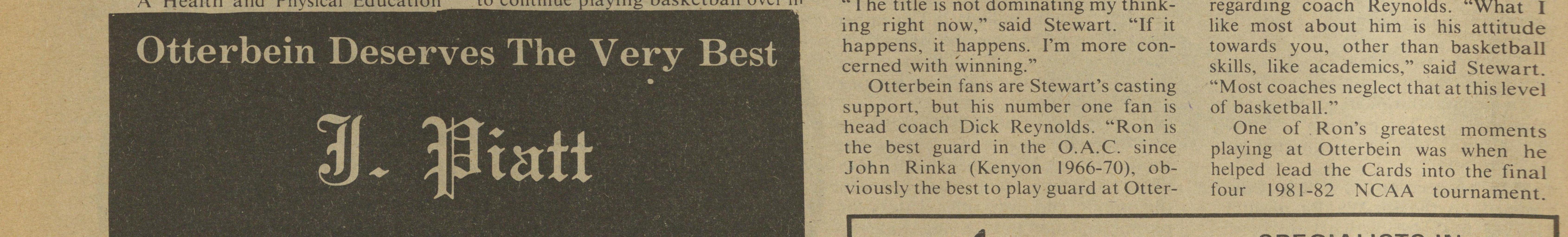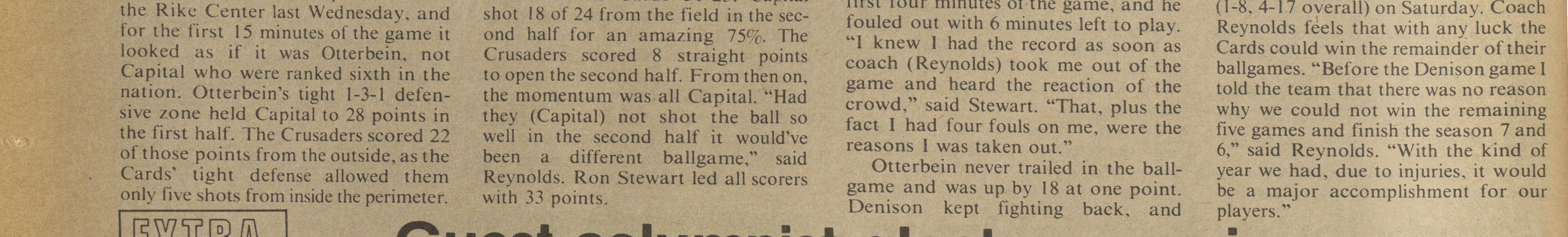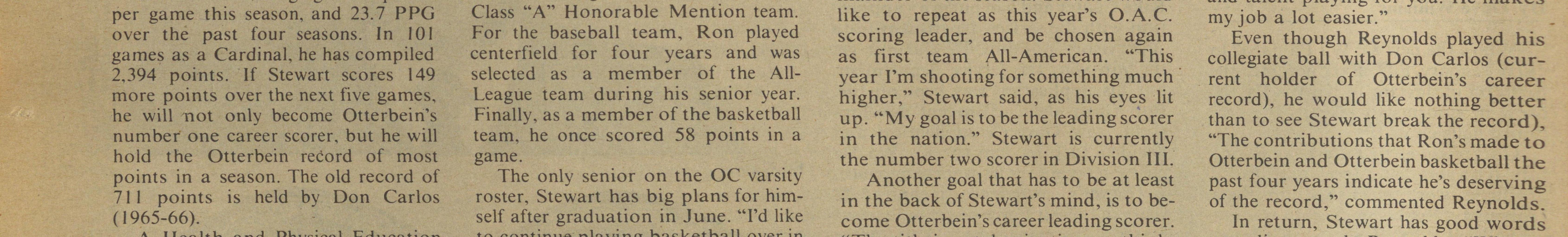 All-American guard Ron Stewart is he played all three major sports at day own my own sporting goods while he was here; teams that comwell on his way into the Otterbein and New Albany. As quarterback for the store." plimented his talents. It's always a O.A.C. record books. New Albany football team, Stewart He also has big plans for the re- pleasure having a player of his calibar Stewart is averaging 31.8 points received recognition on the state's mainder of the season. Stewart would and talent playing for you. He makes per game this season, and 23.7 PPG Class "A" Honorable Mention team. like to repeat as this year's O.A.C. my job a lot easier." over the past four seasons. In IO I For the baseball team, Ron played scoring leader, and be chosen again Even though Reynolds played his games as a Cardinal, he has compiled centerfield for four years and was as first team All-American. "This collegiate ball with Don Carlos (cur2,394 points. If Stewart scores 149 selected as a member of the All- year I'm shooting for something much rent holder of Otterbein's career more points over the next five games, League team during his senior year. higher," Stewart said, as his eyes lit record), he would like nothing better he will not only become Otterbein's Finally, as a member of the basketball up. "My goal is to be the leading scorer than to see Stewart break the record), number one career scorer, but he will team, he once scored 58 points in a in the nation." Stewart is currently "The contributions that Ron's made to hold the Otterbein record of most game. the number two scorer in Division III. Otterbein and Otterbein basketball the points in a season. The old record of The only senior on the OC varsity Another goal that has to be at least past four years indicate he's deserving 71 I points is held by Don Carlos roster, Stewart has big plans for him- in the back of Stewart's mind, is to be- of the record," commented Reynolds. ( 1965-66). self after graduation in June. "I'd like come Otterbein's career leading scorer. In return, Stewart has good words