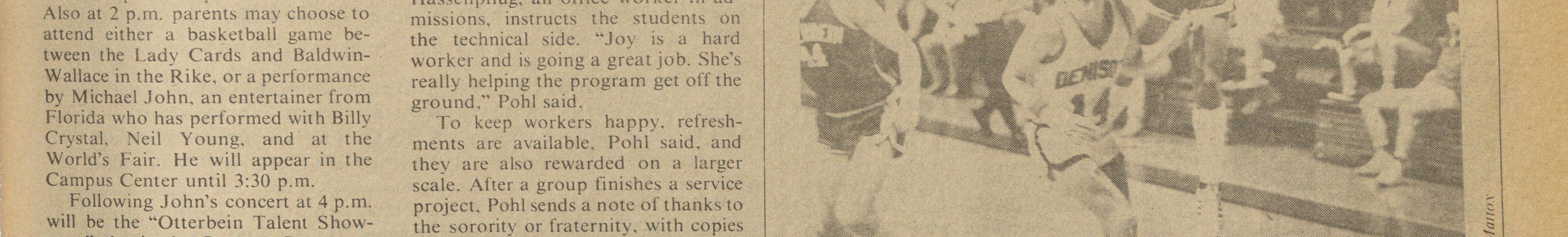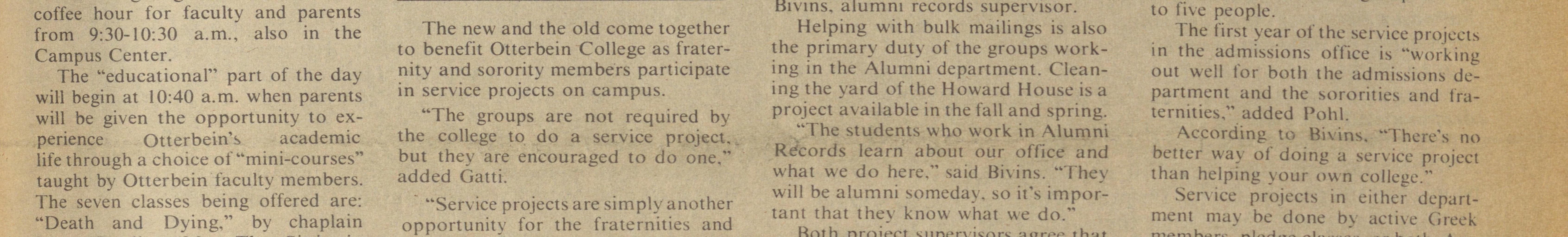 The "educational" part of the day will begin at 10:40 a.m. when parents will be given the opportunity to experience Otterbein's academic life through a choice ot "mini-courses" taught by Otterbein faculty members. The seven classes being offered are: "Death and Dying," by chaplain Monty Bradley; "More Than Sitting in Class: The Active Learner," by Mr. Wayne Rittenhouse; "'Chemistry Affects You Everywhere," by Dr. Robert Place: "Social Security: A Brief View" by Prof. John Glascock; "Bafa Bafa: A Cross-Cultural S imulation," by Dr. Mary Fonow and Dr. .Judith Ayers; "Computer Science at Otterbein College." by Dr. Roy Reeves; and "Changes in Life: Myth and Reality About Menopause,'' by Prof. Fran Davis.