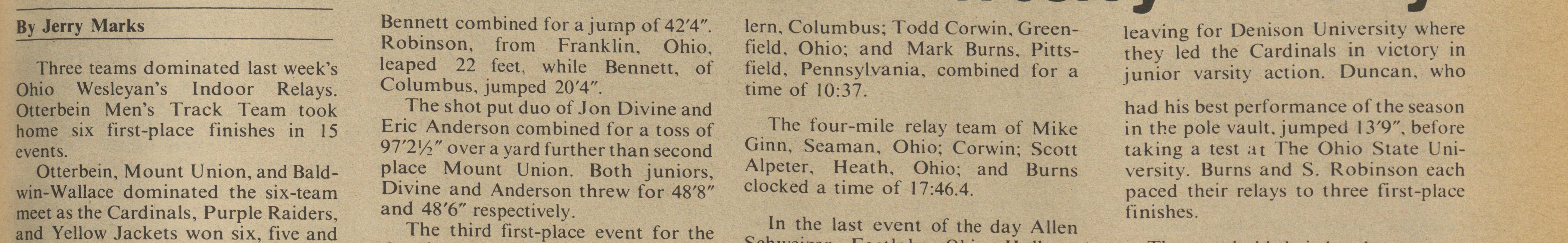 Three teams dominated last week's leaped 22 feet, while Bennett, of field, Pennsylvania, combined for a junior varsity action. Duncan, who Ohio Wesleyan's Indoor Relays. Columbus, jumped 20'4". time of 10:37. Otterbein Men's Track Team took The shot put duo of Jon Divine and