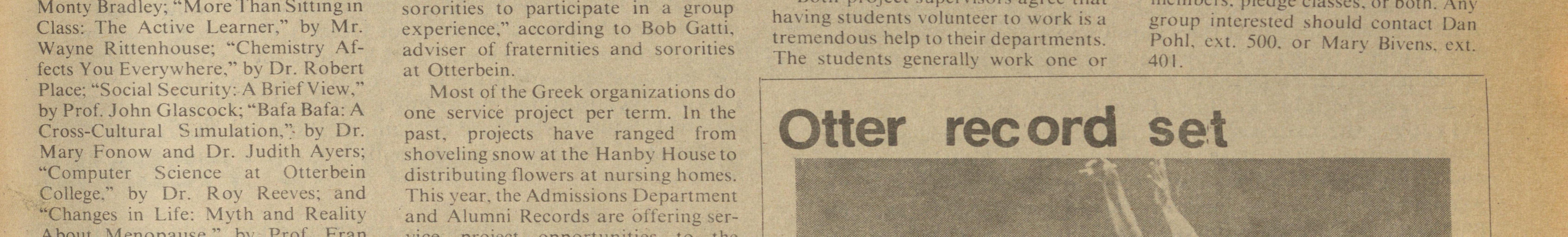 "Service projects are simply another opportunity for the fraternities and sororities to participate in a group experience." according to Bob Gatti. adviser of fraternities and sororities at Otterbein.
