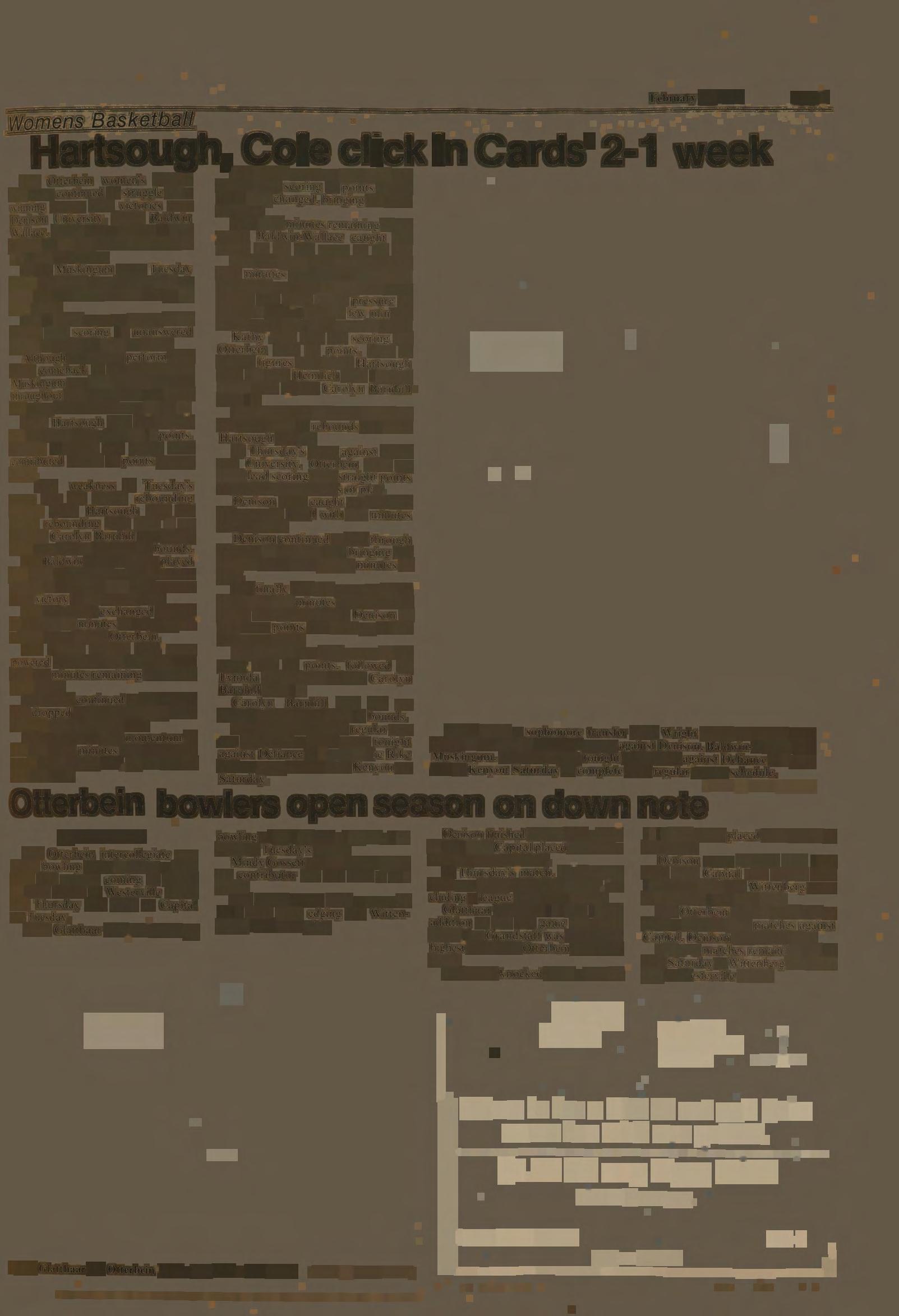 The Otterbein women's basketball team continued to st ruggle for a winning season with victories over Denison University, 77-65; Baldwm Wallace, 85-80; and a loss to Muskingum, 98- 73. The Cards now st a nd at 11-10 for the season.