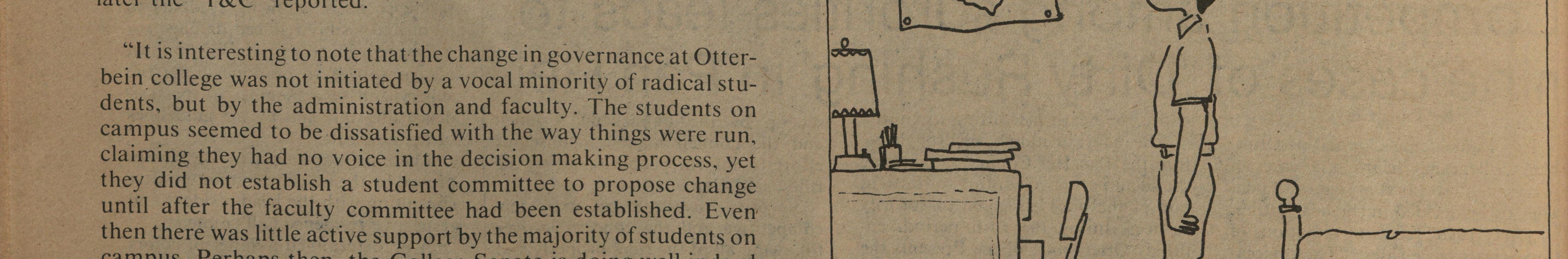 "It is interesting to note thatthe change in governance at Otterbein college was not initiated by a vocal minority of radical students, but by the administration and faculty. The students on campus seemed to be dissatisfied with the way things were run, claiming they had no voice in the decision making process, yet they did not establish a student committee to propose change until after the faculty committee had been established. Even then there was little active support by the majority of students on campus. Perhaps then, the College Senate is doing well indeed just to exist."
