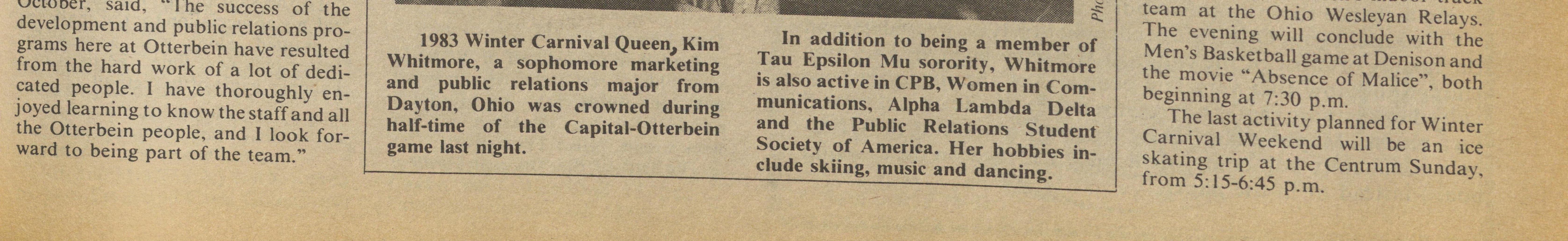Director of Development Robert Rike Center. Also at 2 p.m. is the Fogal, who came to Otterbein last Womens Basketball game at Mt. October, said, "The success of the Vernon. and the Men's indoor track development and public relations pro team at the Ohio Wesleyan Relays. grams here at Otterbein have resulted 1983 Winter Carnival Queen., Kim In addition to being a member of The evening will conclude with the from the hard work of a lot of dedi Whitmore, a sophomore marketing Tau Epsilon Mu sorority, Whitmore Men's Basketball game at Denison and cated people. I have thoroughly en and public relations major from is also active in CPB, Women in Com the movie "Absence of Malice", both joyed learning to know the staff and all Dayton, Ohio was crowned during munications, Alpha Lambda Delta beginning at 7:30 p.m. the Otterbein people, and I look for half-time of the Capital-Otterbein and the Public Relations Student The last activity planned for Winter ward to being part of the team." game last night. Society of America. Her hobbies in Carnival Weekend will be an ice clude skiing, music and dancing. skating trip at the Centrum Sunday. from 5:15-6:45 p.m.