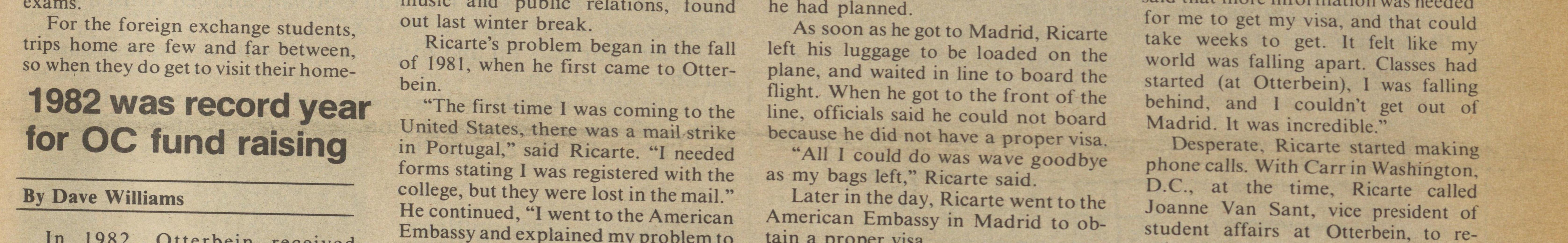 Later in the day, Ricarte went to the He continued, "I went to the American American Embassy in Madrid to ob Joanne Van Sant, vice president of In 1982, Otterbein received Embassy and explained my problem to tain a proper visa. student affairs at Otterbein, to re$1,602,500 in gifts, "the best year in the official. He called the college, solve the problem. "I got to the embassy in the after Otterbein's history," according to and when my registration was con continued on page 4 noon, but the lady said l couldn't get James Scarfpin, associate director of firmed, he gave me a temporary visa." a visa," said Ricarte. "Visas are only development.