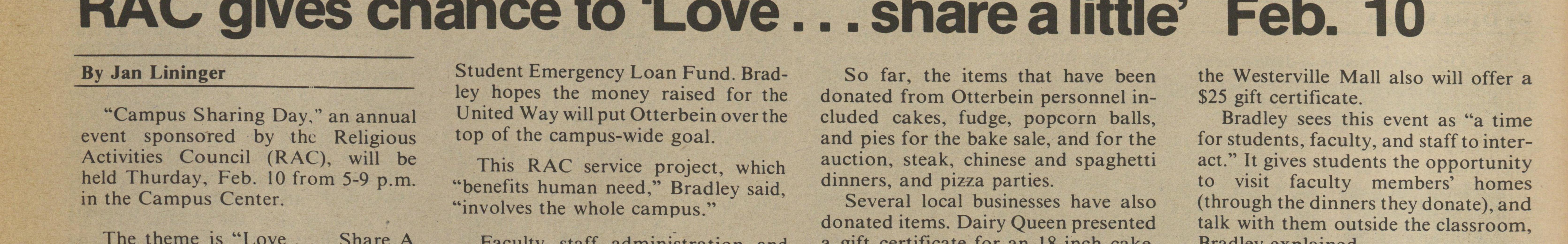 "Campus Sharing Day.'' an annual event sponsored by the Religious Activities Council (RAC), will be held Thurday, Feb. 10 from 5-9 p.m. in the Campus Center.