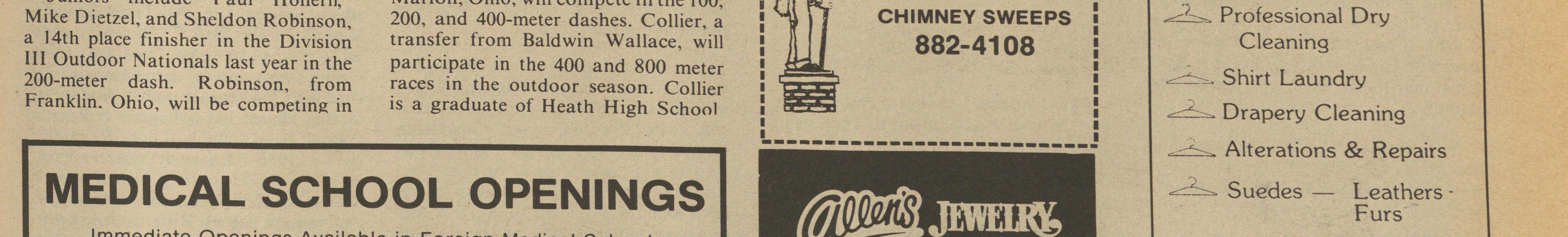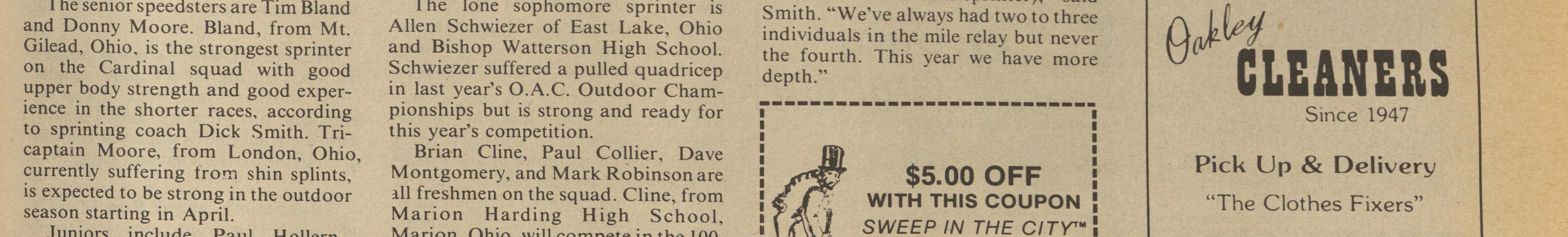 The senior speedsters are Tim Bland The lone sophomore sprinter is Smith. "We've always had two to three and Donny Moore. Bland, from Mt. Allen Schwiezer of East Lake, Ohio individuals in the mile relay but never Gilead, Ohio. is the strongest sprinter and Bishop Watterson High School. the fourth. This year we have more on the Cardinal squad with good Schwiezer suffered a pulled quadricep depth." upper body strength and good exper in last year's O.A.C. Outdoor Chamience in the shorter races. according pionships but is strong and ready for Since 1947
