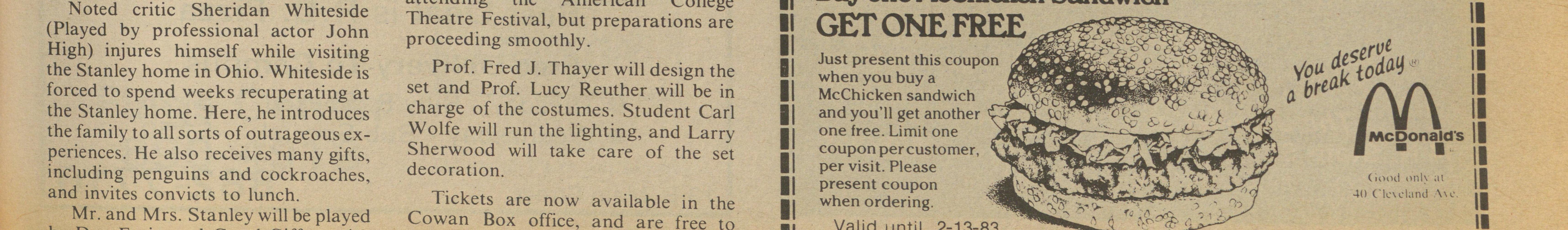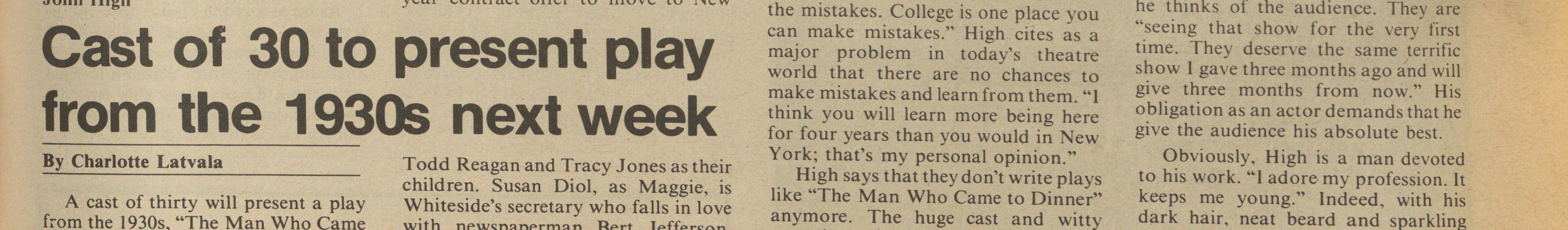 A cast of thirty will present a play from the 1930s, "The Man Who Came to Dinner", Feb. 9-12, at 8:15 p.m. in Cowan Hall.