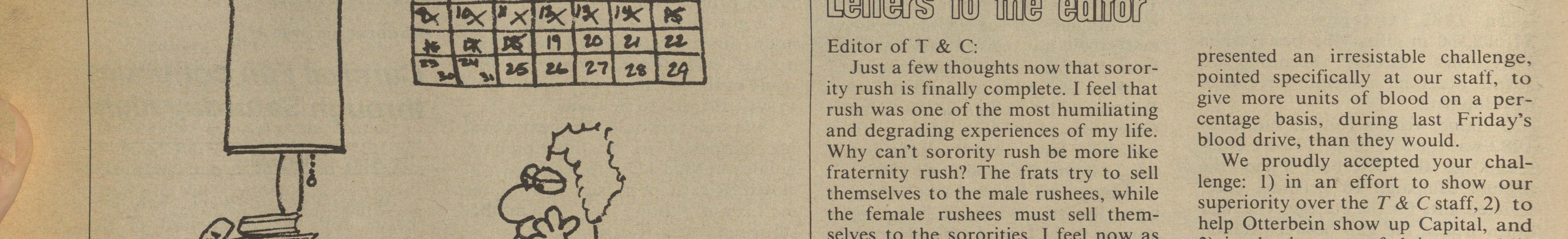 Just a few thoughts now that soror pointed specifically at our staff, to ity rush is finally complete. I feel that give more units of blood on a per rush was one of the most humiliating centage basis, during last Friday's and degrading experiences of my life. blood drive, than they would. Why can't sorority rush be more like We proudly accepted your chal fraternity rush? The frats try to sell lenge: l) in an effort to show our themselves to the male rushees, while superiority over the T & C staff, 2) to the female rushees must sell them help Otterbein show up Capital , and selves to the sororities. I feel now as 3) in the interest of doing a public though active sorority members are service. (Those of us in radio are al looking down on me saying, "Ha! Ha! ways interested in serving the public You're not good enough for us." The interest.} We did so knowing very day after pledge night was strange for well that the disadvantage was on some of us who signed independent. our side. After all, we do have a We felt left out and hurt seeing all working staff of 57 members in com the pledges in their sorority shirts and parison to your rather scant 28 (as jackets, and, at the same time, we were listed in the owner's box). being congratulated by people for